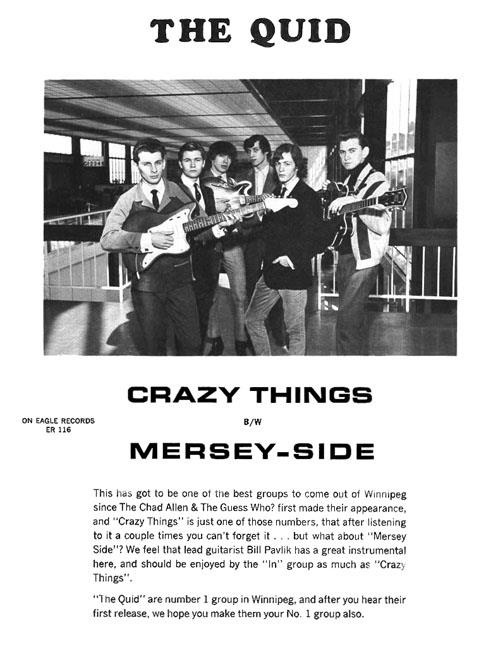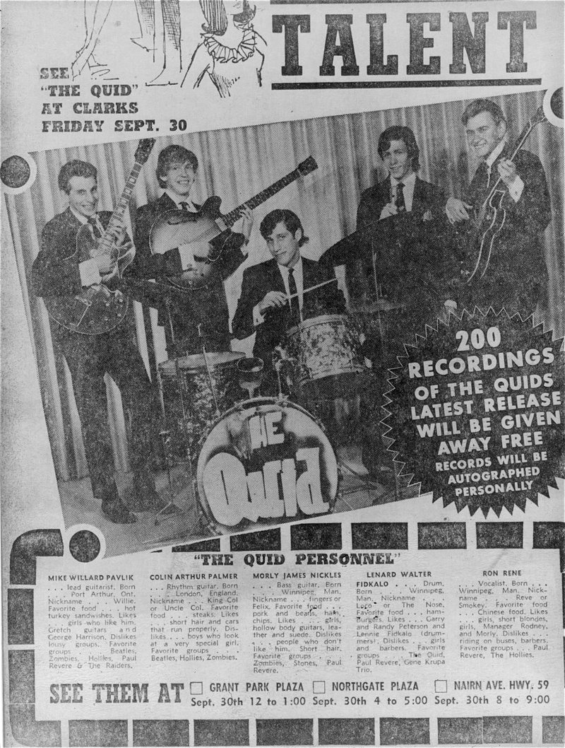 The Quid, A great band from Winnipeg, Manitoba Canada, The band picture is taken at the Twilight Zone club 1965. Picture features Ron Rene on vocals, Morley Nichols on Bass, Al Johnston on Drums, Colin Palmer, and Bill Pavlik on Guitars. Their were two other drummers with the band at different times, Lenny Fidkalo and Dwayne St. Marie. Bob Barton was a singer with this band also. Ron went on to "The Fifth" and was always a great voice and front man. He unfortunately left the music scene which prompted Burton Cummings to sing a line in one of the Guess who songs, "And fade away, Like Ron Rene, Allright." To Bad...