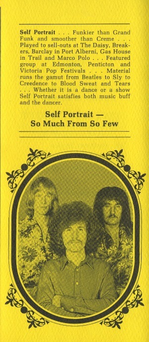 The group maintained an active gigging schedule throughout 1970, with a full calendar of shows under the name "Self Portrait Breakers," suggesting a strong presence on the Vancouver-area club circuit. Their promotional material at the time billed them as “funkier than Grand Funk and smoother than Creme,” highlighting performances at venues like The Daisy, Breakers, the Barclay in Port Alberni, Gas House in Trail, and the Marco Polo. They were also a featured act at major pop festivals in Edmonton, Penticton, and Victoria. Their repertoire ranged from the Beatles to Sly & the Family Stone, Creedence Clearwater Revival, and Blood, Sweat & Tears—aiming to satisfy both music lovers and dancers alike.