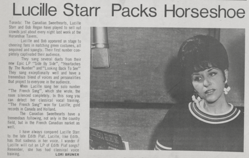 Lucille Raymonde Marie Savoie (later Regan and Cunningham), popular singer, country singer (born 13 May 1938 in St. Boniface, MB; died 4 September 2020 in Las Vegas, Nevada). Lucille Starr was an internationally successful pop music and country singer, and one of a handful of Canadian popular musicians to record in both English and French. Her biggest hit was “The French Song” (“Quand le soleil dit bonjour aux montagnes”). It sold more than 7 million copies in 1964–65, making her the first Canadian woman to sell 1 million records. She was also the first Canadian woman to perform at the Grand Ole Opry in Nashville and the first Canadian woman inducted into the Canadian Country Music Hall of Fame and the Canadian Country Music Association Hall of Honour.