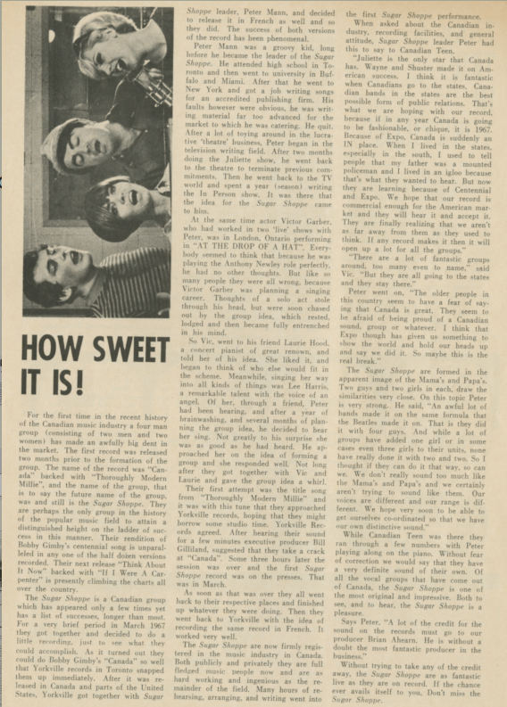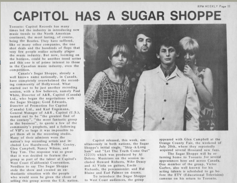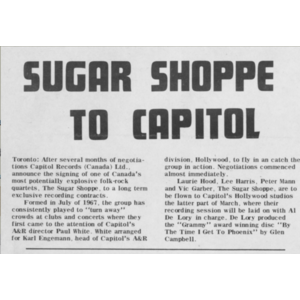 With two male singers (Mann and Garber) and two female (Hood and Harris), they modeled themselves on the Mamas & the Papas and began working in the studio on a project to mark the Canadian Centennial in 1967. The group's first single was Mann's arrangement of Bobby Gimby's song "Canada"; released on the Yorkville label, it reached no.40 on the RPM Canadian singles chart. The follow-up, "The Attitude", was less successful, reaching no.77. However, the group won a recording deal with Capitol Records in Los Angeles, and recorded an album, The Sugar Shoppe, released in 1968. It was produced by Al De Lory and arranged by Mort Garson, with session musicians including "The Wrecking Crew" of Hal Blaine, Carol Kaye, Larry Knechtel, Earl Palmer, Mike Deasy, and Plas Johnson. Tracks included versions of Donovan's "Skip-a-Long Sam", which was also released as a single, reaching no. 73 on the Canadian chart; Bobbie Gentry's "Papa, Won’t You Let Me Go to Town"; Mike Leander's theme song for the movie Privilege (#93); and a re-recorded version of "The Attitude". However, despite appearances on both Ed Sullivan's and Johnny Carson's TV shows, the group's commercial success was limited.