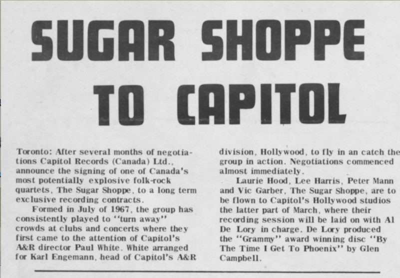 The Sugar Shoppe came together in Toronto as a studio project in 1967. Peter Mann had relocated from New York and met up with Laurie Hood, who was in her last year of a scholarship at the University Of Toronto's Faculty of Music.