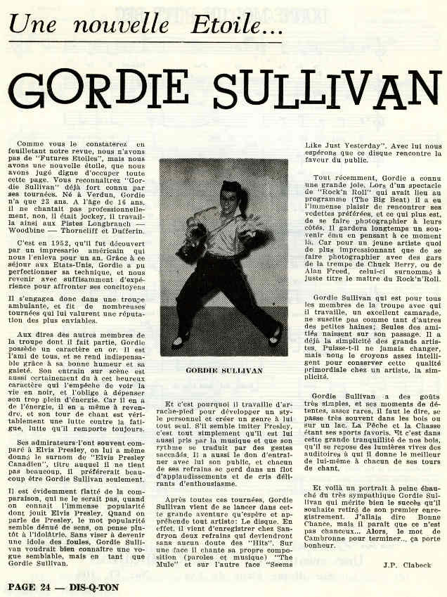Gordie Sullivan was a real horse jockey when not Rock & Rollin'. He toured with local talent revues and put on one heck of a show! Gordie began rockin' in 1957 but only released one 45 in the day. He was nicknamed "Elvis Presley Canadien".