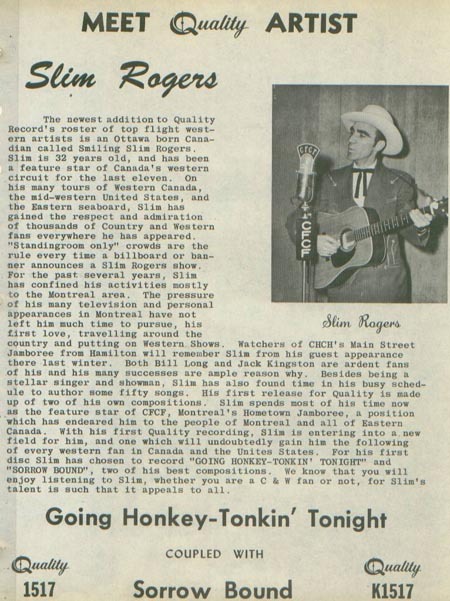 Destry was also instrumental in getting Slim to record for Quality record in 1956. He cut such songs as his own composition Sorrow Bound and Going honky tonkin” tonight. He remain on Hometown Jamboree for 3 consecutives years till the series ended. During this time he played Montreal night clubs such as the Blue Angel Cafe , the Clover, the Main Cafe and the Continental Ballroom. He also played dance hall with his hometowners band , outside of Montreal and the Eastern Townships, booking halls and announcing his date over C.F.C.F. Radio as he performed on his portion of the jamboree each week .