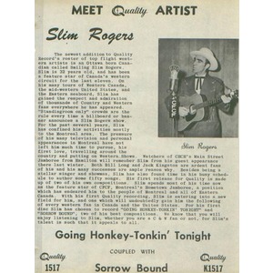 Slim Rogers was born in Ottawa, Ontario, Canada, on Jan 3 / 1923. He has brown eyes and hair, is six feet tall and weighs 140 pounds. He was influenced by movie cowboy Ken Maynard when he was 8 years old. He was also attracted to country music at the age of 10 years old, when coming home from school he saw a street singer whose name was Dick Young performing that day.