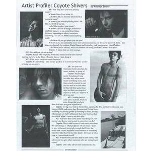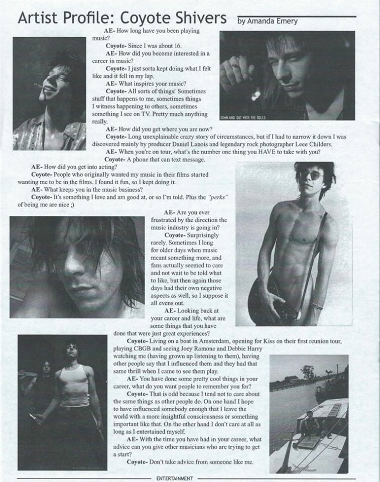 Returning to New York City, he enlisted Billy Ficca on drums (Richard Hell and The Neon Boys' drummer, not to mention a member of the seminal New York band Television). Jack Pedler' eventually took over on drums, and along with Dagon Spector on bass, Coyote released his first solo album (the self titled "Coyote Shivers"), critically acclaimed by a diverse spectrum of media, ranging from Billboard Magazine to Screw Magazine, and from Sassy to High Times. Debbie Harry's bass player, Greta Brinkman, eventually took over on bass guitar, until Coyote formed his most recent lineup featuring Chad Stewart (Faster Pussycat) on drums, and Casper on bass. Greta went on to then play bass for Moby. After a stint as the opening act on the KISS reunion tour, Coyote began writing songs for his forthcoming second album, releasing limited edition CD singles and the 5-song CD "1/2 a Rock & Roll Record", spending most of his time between Hollywood and New York City. Coyote recently finished starring in Down and Out with the Dolls (2001) directed by Kurt Voss and also starring Lemmy of Phil Campbell and Inger Lorre of the Nymphs. Coyote also just finished starring in director Luis Aira's Girl in 2003.