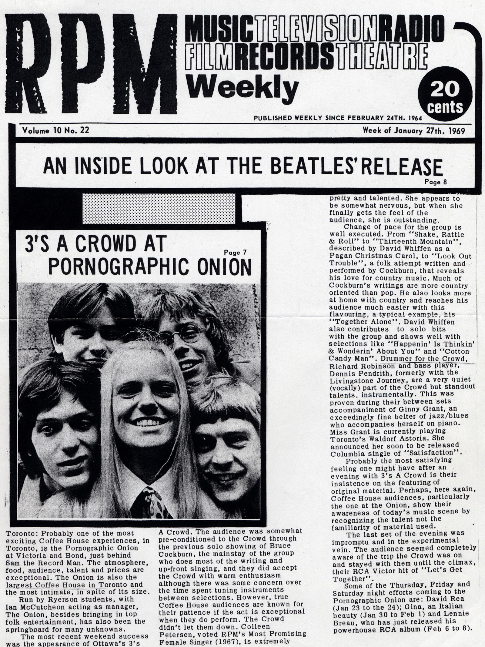 3âs a Crowd spent most of early 1968 showcasing the album, which had yet to be given a Canadian release. The âexpandedâ groupâs debut single, a cover of Bruce Cockburnâs catchy âBird Without Wingsâ was issued in early February (and even gained an Australian release!). Its relative success (peaking at #61 on the RPM chart) coincided with a tour of Western Canada, featuring memorable dates at the Simon Fraser University on 28 February and the Retinal Circus in Vancouver from 1-2 March.