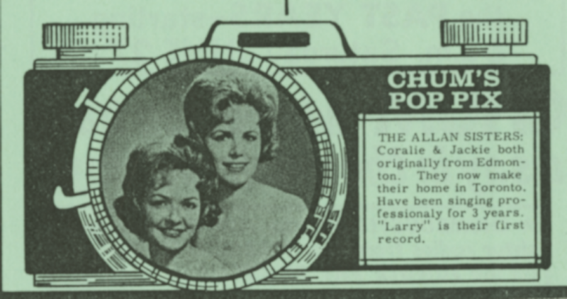 In the early 1960s the sisters moved to Toronto, the hub of Canada’s music industry. There they crossed paths with Art Snider, a key figure on the CBC’s Country Hoedown program and the founder of Chateau and later ACT Records. Snider saw potential in the duo and soon became both their producer and Jackie’s husband. The sisters’ first single appeared in 1964 on the U.S.-based Shell label: “Larry” / “Never on Saturday.” The A-side, a catchy girl-group number, gave them a taste of success, climbing to #35 on the CHUM charts that summer.