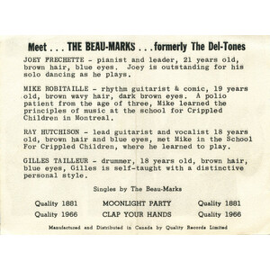 The Beau-Marks comprised Joey Frechette (pianist), Ray Hutchinson (guitarist), Michel (Mike) Robitaille (bass guitarist), and Gilles Tailleur (drummer). The group differed substantially from earlier Canadian male pop acts (vocal ensembles The Crew-Cuts, The Diamonds and The Four Lads), in that the Beau-Marks were a rock band and wrote most of their own material.