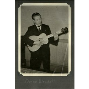 Like many children of immigrants, Omar Blondahl, who grew up in Winnipeg, did not start speaking English until he began school. By the time he reached high school he had studied piano, violin, voice, and music theory, and had performed in local Gilbert and Sullivan operettas. By his late teens he was working in radio dramas. In 1943, following several years of Army service, he returned to radio, working for the next eight years at radio stations in western Canada as a dj, announcer, and performer. As a performer he was involved in drama and music. He played some fiddle but mainly rhythm guitar in old-time music orchestras and sang folksongs to his own guitar accompaniment as a soloist.