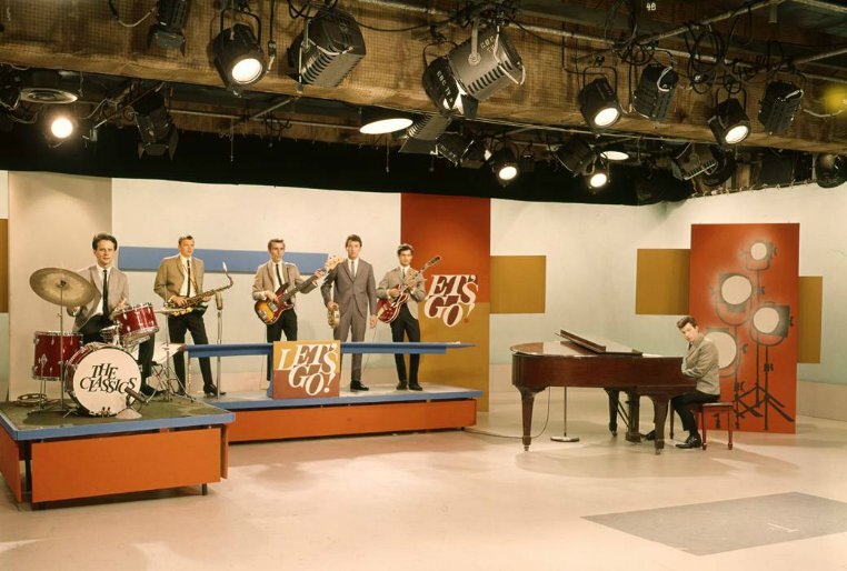 On the right, a new line-up of Probably Us, the 'Let's Go' house band, in 1967 featuring Doug Edwards, Ross Turney, Bob Buckley, Claire Lawrence Terry Frewer & Howie Vickers.