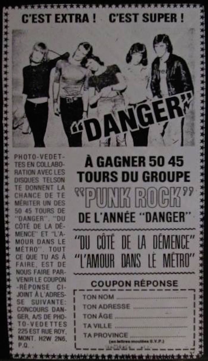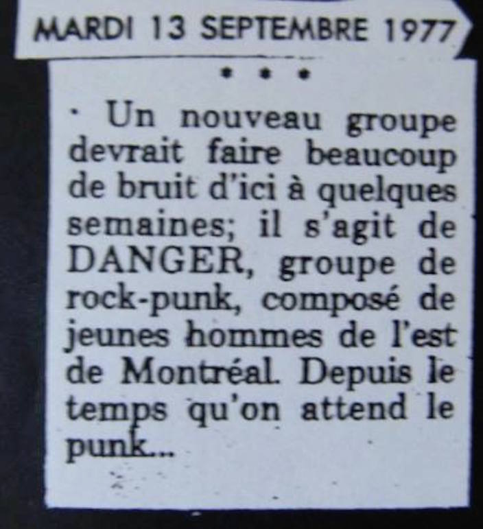 Danger is one of the first French-speaking punk bands in Quebec in the 70's. Danger est l'un des premiers groupes punk francophones au Québec des années 70.