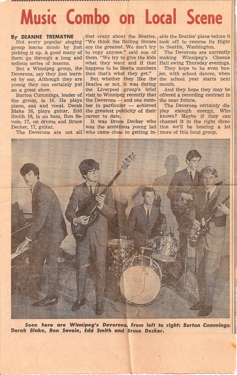 I've only ever been in two bands in my life...the Deverons and the Guess Who. Edd Smith, Derek Blake, Boris Pawluk and John Gach all went to St. John's High when I did. Those four started rehearsing in John Gach's parents' basement, a beautiful rumpus room with really good acoustics. It was one of those older houses dripping with personality and vibe, directly across the street from the beautiful St. John's Park?pretty cushy, actually. During the days at school, Edd would casually mention what numbers they were currently working on...I would always drool with jealousy...I wanted so much to be in the band. They played instrumentals only...none of them sang. I guess their "repertoire" consisted of numbers by the Ventures, Fireballs, Chantays, Surfaris, Duane Eddy, and any other guitar-based instrumental acts of the day. After a few weeks of hearing about the Deverons second hand through Edd, I asked him if I could come to a practice and listen. That week I found myself in the Gachs' basement at a Deveron practice. I asked them if I could sing something...would they play along...