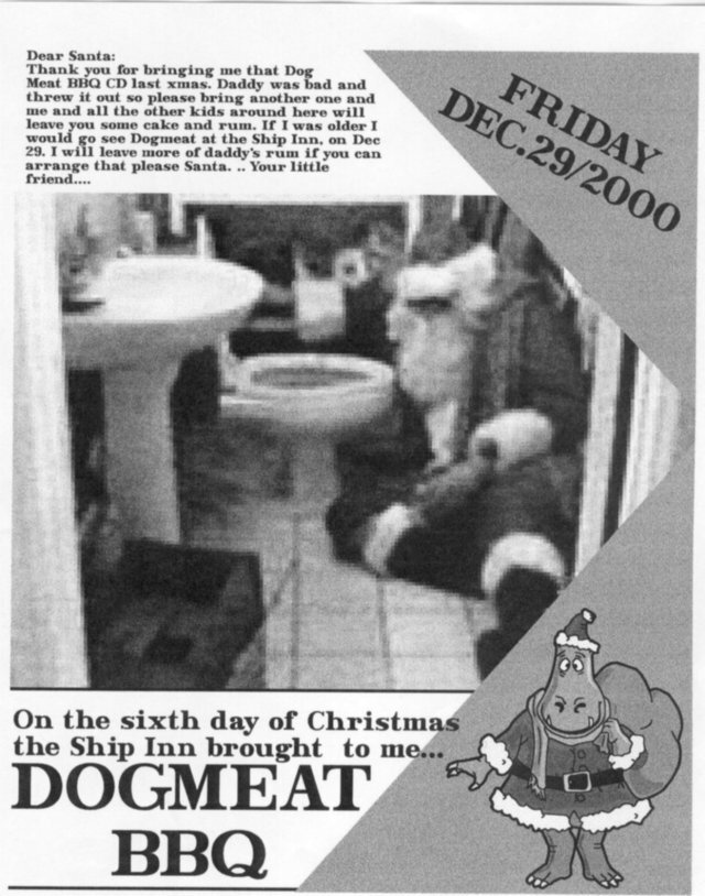 The following December, at Duncan's instigation, Dog Meat BBQ got together for a "Nine-and-a-halfth Year Anniversary" reunion show at Vinyl's in St, John's. The reunion show, which also featured performances by Wet Cheese Delerium and Ditch, drew a surprisingly large crowd. The band enjoyed this gig so much that they performed again at the Ship Inn in August 1996 and yet again in December of that year. It seemed that the band was gradually coming together again as a going concern, as evidenced by the fact that they had begun writing new songs.