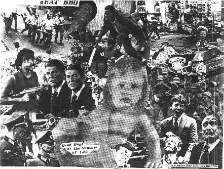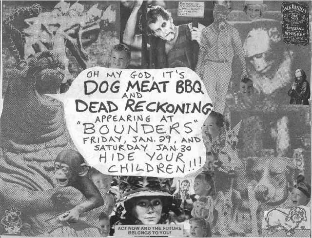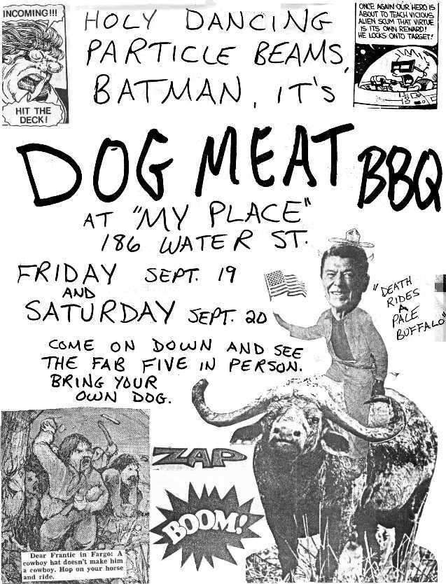 To celebrate the March 1987 release of Dead Dogs, Dog Meat BBQ played a special show at the Cornerstone, a "video disco" on George Street in St. John's. To spice up this show, the band decided to put the club's giant video screen to use. Wallace and Mike put together a video collage presentation which ran on the screen behind the band throughout their two sets. It included footage from war movies, cartoons, the news, soap operas and whatever else they could come up with. Pictures and a review of this show can be found elsewhere on this website.
