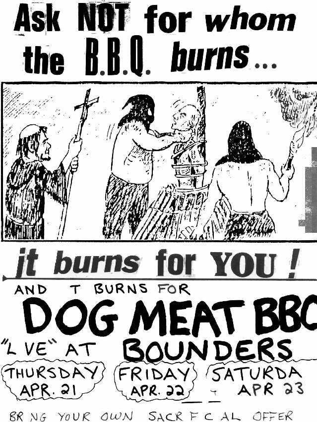 Dog Meat BBQ was formed in St. John's, Newfoundland, in the early summer of 1986. The main instigators were vocalist Mike O'Brien and guitarist Wallace Hammond, formerly of The Bubonic Plague, a punk band formed in St. John's in 1982, which had disbanded in Toronto in 1985. They were soon joined by bassist Duncan Snowden of The Riot, another St. John's punk band. Filling out the initial line-up was drummer Justin Hall, who had earlier played with Wallace in the legendary punk group Da Slyme.