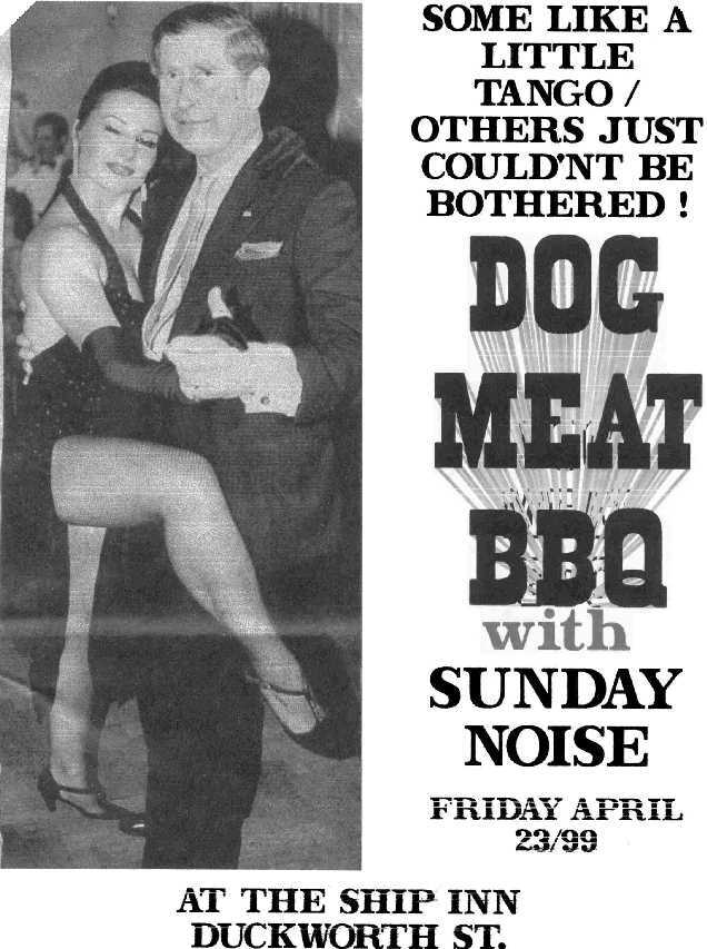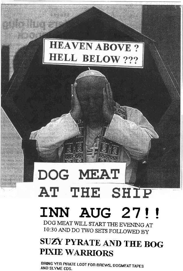 By this time, Dog Meat BBQ were beginning to perform more frequently, sharing bills with local groups like Bucket Truck, Sunday Noise and Hardliner. In August 1999, the band performed at the Pyrate Festival at the Ship Inn, hosted by Suzy Pyrate & the Bog Pixie Warriors.
