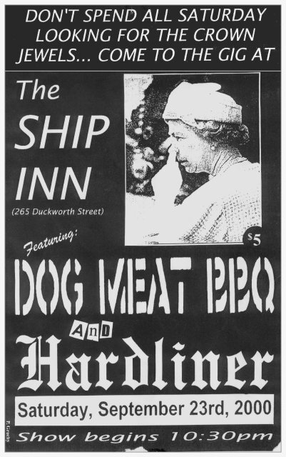 Justin returned later in the summer, at which time the band were joined by Tony Richards, another ex-member of Da Slyme, on harmonica and vocals. The resulting five-piece band then began making the rounds of the St. John's club scene. The group's repertoire included songs which had been done by The Bubonic Plague and Da Slyme, plus a growing number of new original tunes. The band also played covers of the Sex Pistols and the Dead Kennedys, as well as punked-up versions of songs by Bob Dylan, Merle Haggard and the Rolling Stones. (Read a list of cover versions done by Dog Meat BBQ over the years).