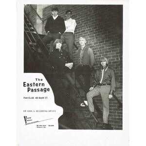 The Eastern Passage, fronted by guitar player and singer John Lacasse, came closer to the big time than any other SJA group when Warner Brothers almost signed them to a deal for the United States in 1968. Starting as The In-Crowd, they evolved into The In-Sect, before settling on their final name. By this time, in 1967, they had become firmly established on the local scene. Being one of the groups that Donald Billows managed, they frequently played at his club, opening for touring acts and frequently headlining. For their vinyl debut, on Sir John A., they refurbished "When You Ask About Love," an old Crickets tune. It did reasonably well, but failed to chart high enough to qualify as a real success. The ambitious young men then went about producing what they hoped would be a number one hit, not only in Canada but also in the U.S. Billows entered into an arrangement with a well-connected promoter in Ohio, who could help them get their new record into rotation on some of the United States' top radio stations. Within a month of its independent release on the band's own Zoo label, "I Could Make You Fall In Love" had charted in Pittsburgh, Cleveland and had been chosen as a pick to click on WABC in New York. By July 1968, Warner Brothers had picked the single up for distribution, just as the flip-side was starting to get some action. After ten thousand copies had been sold in a relatively limited market, executives at the company finally decided to sign the group. They were even booked to play on Upbeat, a popular American Midwest TV show. Unfortunately, internal wrangling at Warner Brothers put the signing on hold and kept the band in limbo. The single began to slip off the charts and, with no other recordings to bolster them, Warner Brothers lost interest. They continued to play in and around Ottawa until 1970, when they called it a day after an outdoor gig at Pineland.