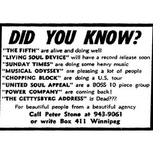 1968 saw the release of two more singles - Sunshine People (b/w Don't Worry About Me Babe) and All I Want is Love (b/w Caprice). By the close of 1968, The Fifth had become one of the most popular and dynamic groups on the Winnipeg music scene, and named one of the top three bands in the city.