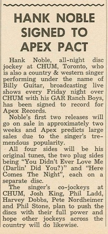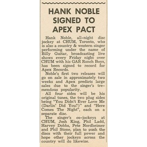 In 1958, he was the all-night disc jockey over radio station CHUM in Toronto. Hank and his band The Night Hawks appeared live over CHUM at 10:30pm on Friday nights and did personal appearances throught Ontario and at the Palace Pier in Toronto. During this time he recorded under the name Billy Guitar.
