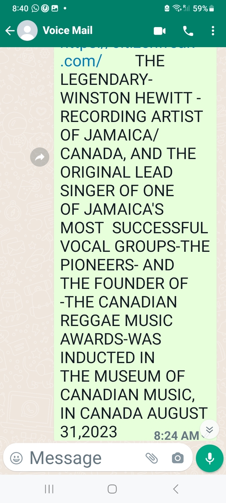 In addition to being the driving force behind the Canadian Reggae Music Awards, Winston is the original lead singer and one of the founding members of one of Jamaica's top international reggae vocal group 'The Pioneers'. Hewitt, working out of Toronto, Canada has taken part in most of the reggae festivals across Canada and around the world. Winston has performed with superstars such as Jimmy Cliff, Bob Marley, Dennis Brown, Marcia Griffiths, Freddie McGregor, Jackie Edwards, Dobby Dobson, Ernie Smith, Millie Jackson, Jerry Butler, The Manhattans, Melba Moore and many others.
