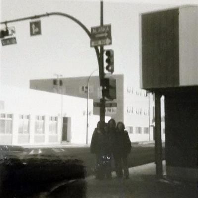 "Hot House" standing at a street corner in Dawson Creek, B.C., under the "One Way to Alaska" road sign. circa 1980.