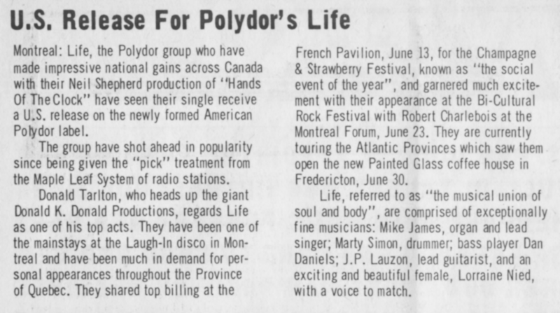 In the aftermath of the single’s release and its rise up the charts, Life played its biggest concert of its short-lived career - the First Montreal Bi-Cultural Pop Festival, held at the Montreal Forum alongside Triangle, Robert Charlebois and headliners Steppenwolf.