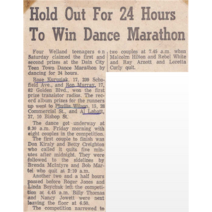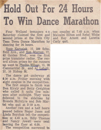 Ron Murray and Rose Kuruziak dance for 24 hours to take top prize - a transistor radio! Al Labatt and Phyllis Wilson take 2nd prize - a record album!