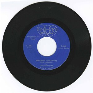 Amato Records was a small independent label in Toronto, known primarily for private-press releases by Benny Spada & The Flames in 1962. Marrs Five sit as an unusual youth-beat entry in that short catalog, illustrating the ad-hoc, community-driven nature of many early Canadian independent labels — someone with access to a pressing plant helping a local group get a single out into the world.