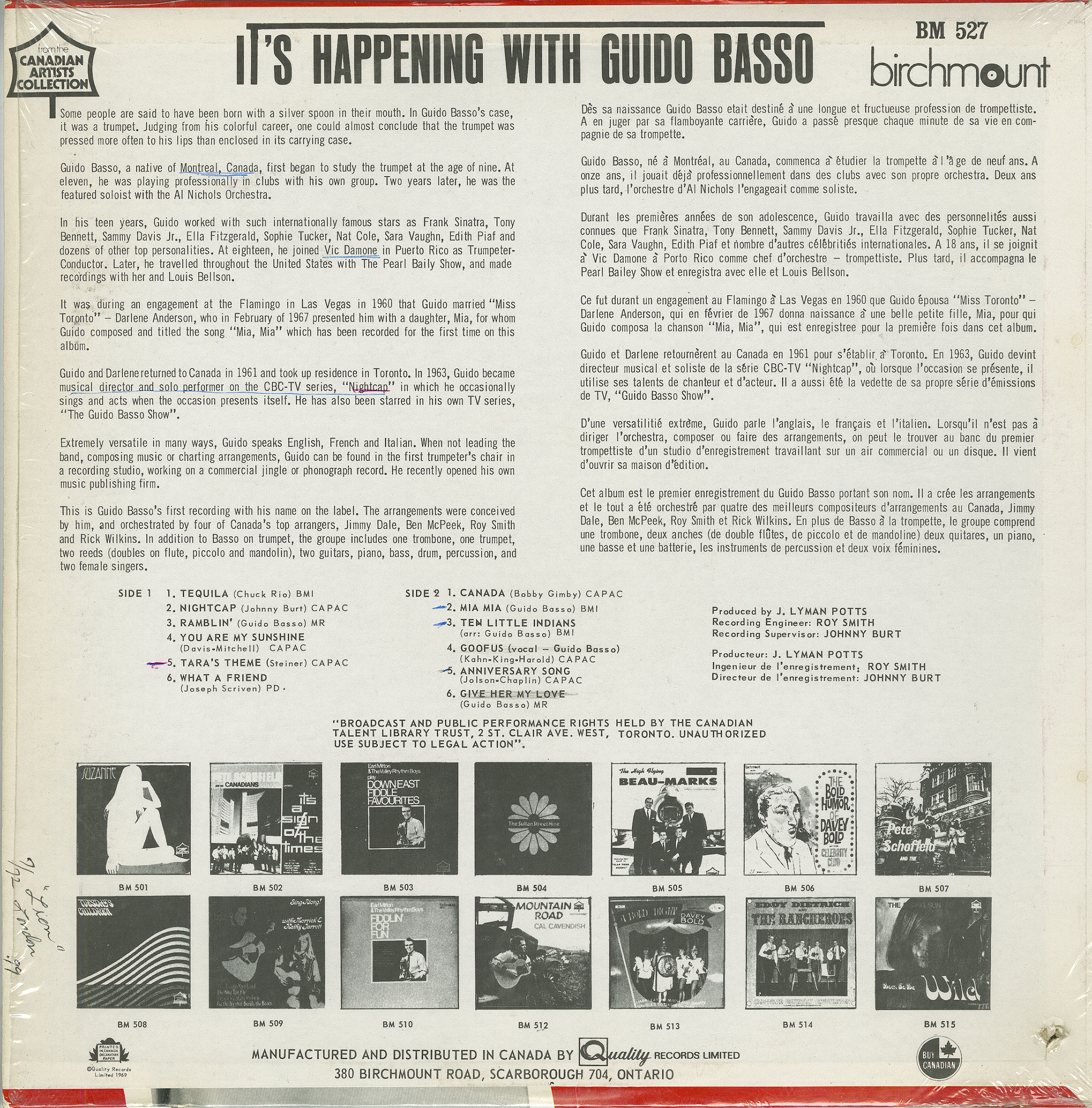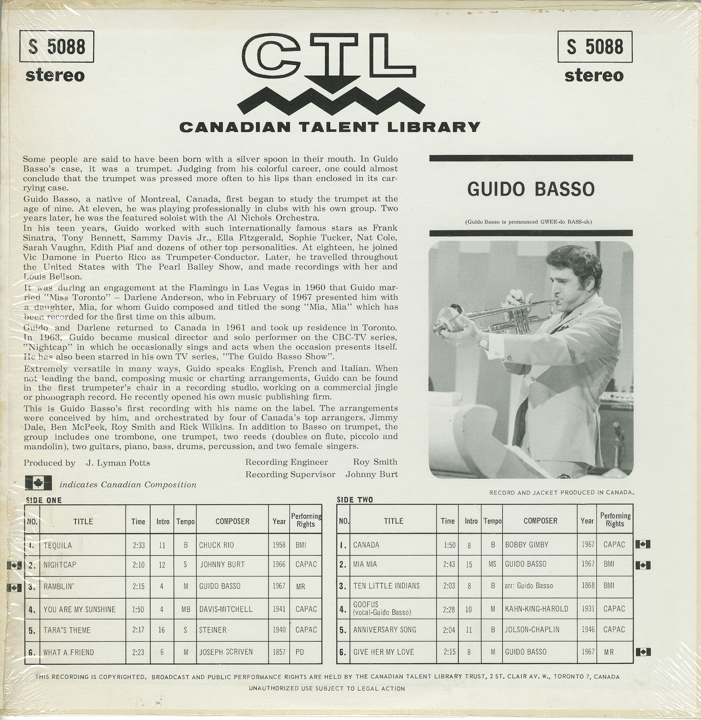 Throughout the 1970s, McPeek continued to balance commercial recording, orchestral writing, and film work. His credits include scores for films such as The Rowdyman, Catch the Sun, and Only God Knows, as well as arrangements for artists including Laurie Bower and Bachman-Turner Overdrive. His arranging work during this period also encompassed major Canadian jazz and studio projects, including contributions to Canadian Talent Library recordings by leading soloists. Among these was Guido Basso’s 1967 CTL album It’s Happening, on which McPeek was one of several featured arrangers alongside Jimmy Dale, Roy Smith, and Rick Wilkins, placing him firmly within Toronto and Montréal’s elite studio-jazz circle.
