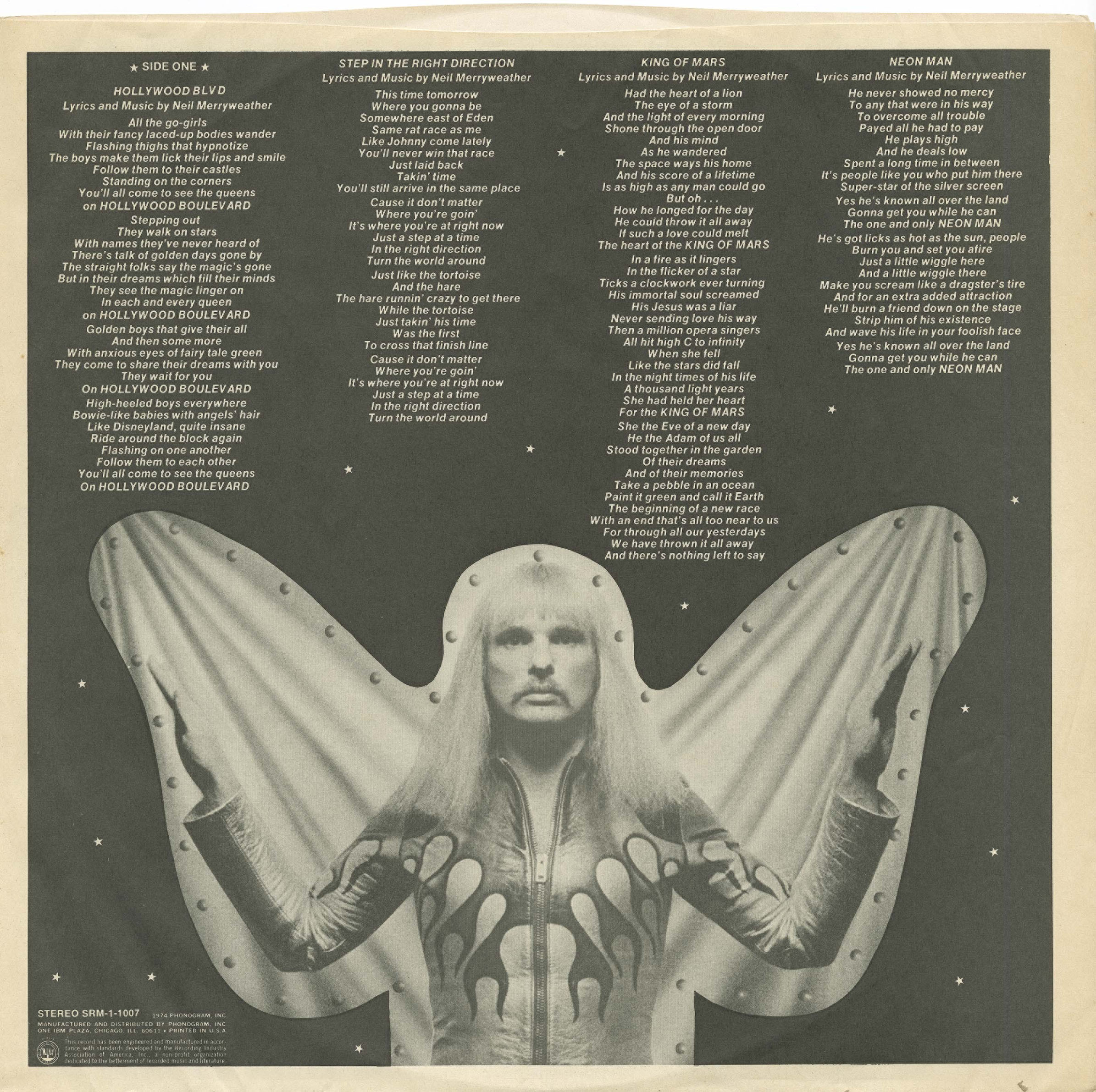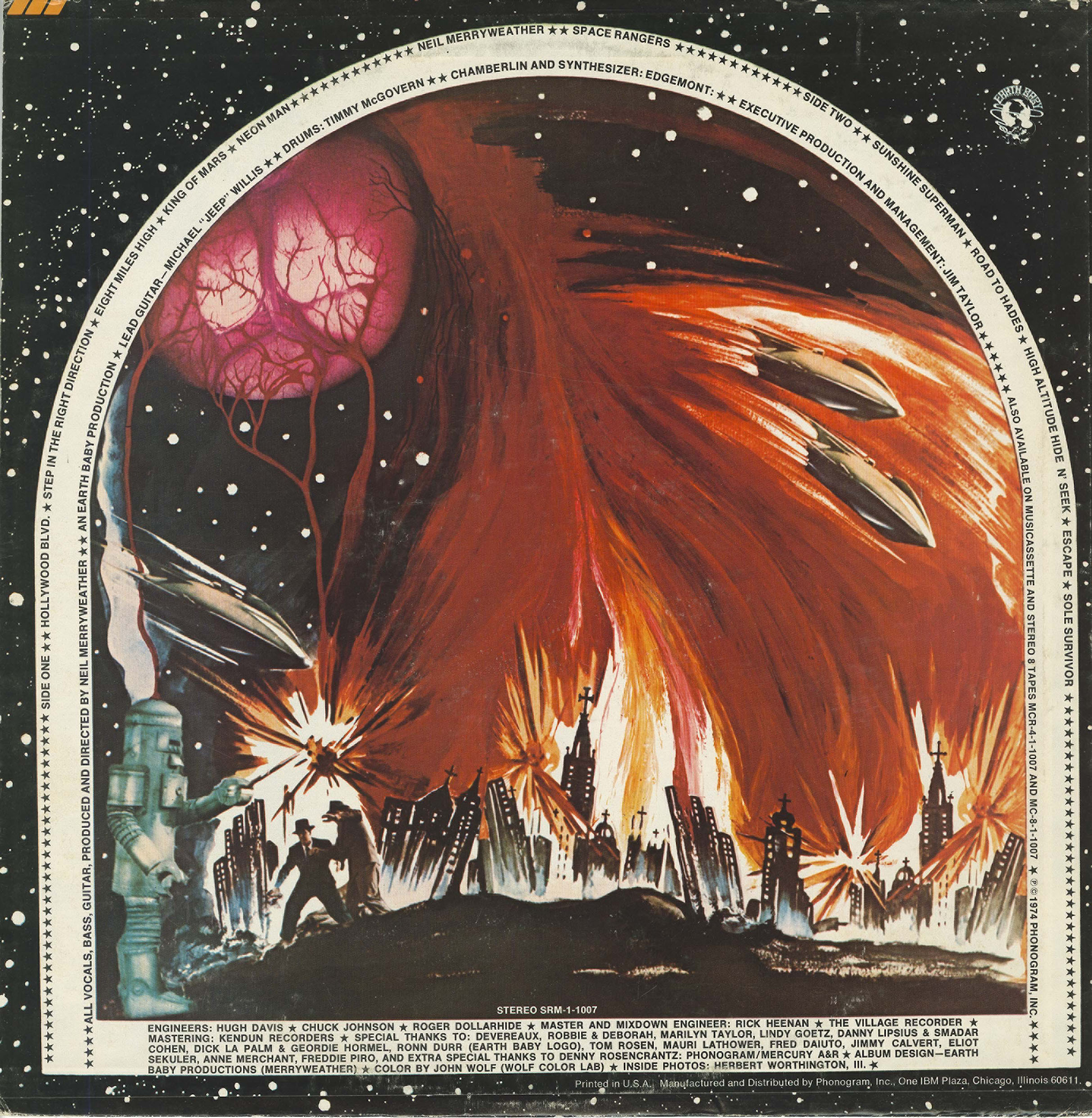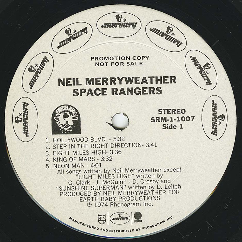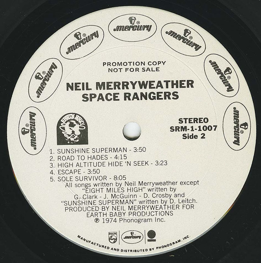 In 1974 Merryweather put a new band together called the Space Rangers. Through friend Morey Lathower (VP of A&R at Capitol) he was able to secure time at Capitol Records studios and in two nights he recorded the Space Rangers' first album. Neil used whatever funds he had left after the Mama Lion years and supported the new band until the money ran out. Unfortunately so did the band's keyboardist and guitarist. Neil's Mama Lion road manager Robbie Randal stuck with Neil and took the tape of the Space Rangers album into the office of Chip Taylor (Canned Heat). When the album was played Chip's brother Jim Taylor heard the new sound and offered to manage Neil. Taylor got a deal with Mercury Records and Neil was signed. Original Space Rangers drummer Tim McGovern remained loyal to the band and Neil hired keyboardist/guitarist Jamie Herndon and lead guitarist Michael Willis and the new band was ready to go. Neil bought a Chamberlin keyboard from Sonny & Cher. The Chamberlin was a key to the Space Rangers sound. The band was booked into the Whiskey when the Space Rangers album was released (1974). The album went to the No. 5 most added on radio airplay chart in two weeks. The label did nothing to support the album or the band. Six months later the small advance Neil got for Space Rangers was all but gone and in desperation to keep the band together Neil took the band into Village Recorders and in five days wrote all the songs, recorded and produced his second album for Mercury called Kryptonite. The label bought the album and it was released in 1975. The label still did not do anything to help the band or push the albums. Neil disbanded the Space Rangers due to lack of support and to weak management. The Space Rangers and Kryptonite albums received the highest praise from critics worldwide and Kryptonite was voted into the top five Psych Rock albums of the Seventies in an internet poll. Notable cuts included a cosmic psych rock version of The Byrds' "Eight Miles High" and the David Bowie-inspired single "Hollywood Blvd.", as well as the blistering autobiographical rocker "The Groove". The albums continue to gain a cult following to this day.