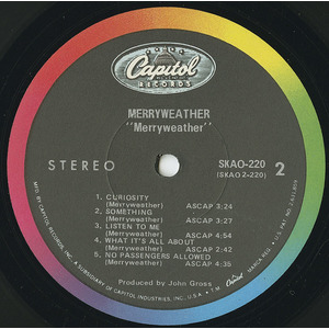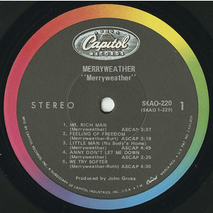 The band adopted the name 'Heather Merryweather' after the title of one of the songs they recorded with lyrics by band friend, June Nelson. Nelson was Mo Ostin's secretary at Warner Bros. Records for many years. She was also responsible for pushing the band to go to LA. After they arrived in the summer of '68 the boys in the band were welcomed into the home of Linda Stevens in Topanga Canyon. Stevens was a folk singer and songwriter and friend of Buffalo Springfield. She offered not only a place to stay but allowed the band to rehearse in the house. Heather Merryweather's first gig was to be at the legendary Topanga Coral but the night before they were to play the Coral burned down. The Coral owners quickly rented a store on Ventura Blvd and opened the new club as Big Pink. Heather Merryweather were the first band to play the club. During their performances the band noticed that Jimmy Livingston seemed to change and his performance fell short of what was expected. Jimmy chose to party rather than play, and he and the band parted ways. Neil took over the vocals and began writing new material. Heather Merryweather soon found themselves sharing the bill with Chicago Transit Authority at the Whisky a Go Go in Hollywood. From that performance they were signed by the new A&R rep John Gross. Gross became the band producer. The band decided to shorten their name to 'Merryweather' after the album was completed. Neil was at Capitol Records one day to oversee the final cover art and ran into Linda Ronstadt. Both being newly signed to Capitol they began a chat while sitting on the front steps of the Capitol Tower. Neil told her about the band and she was excited about her Capitol deal and was waiting to meet up with her Stone Poneys' producer Nick Venet. When Nick arrived she jumped up and turned to Neil and said "it was great meeting you Neil Merryweather!" Neil liking what Linda had called him immediately ran back upstairs to see the album's cover designer Robert Lockart and had the name Neil Merryweather added to the album credits. Neil legally changed his name and began a long recording career as Neil Merryweather.