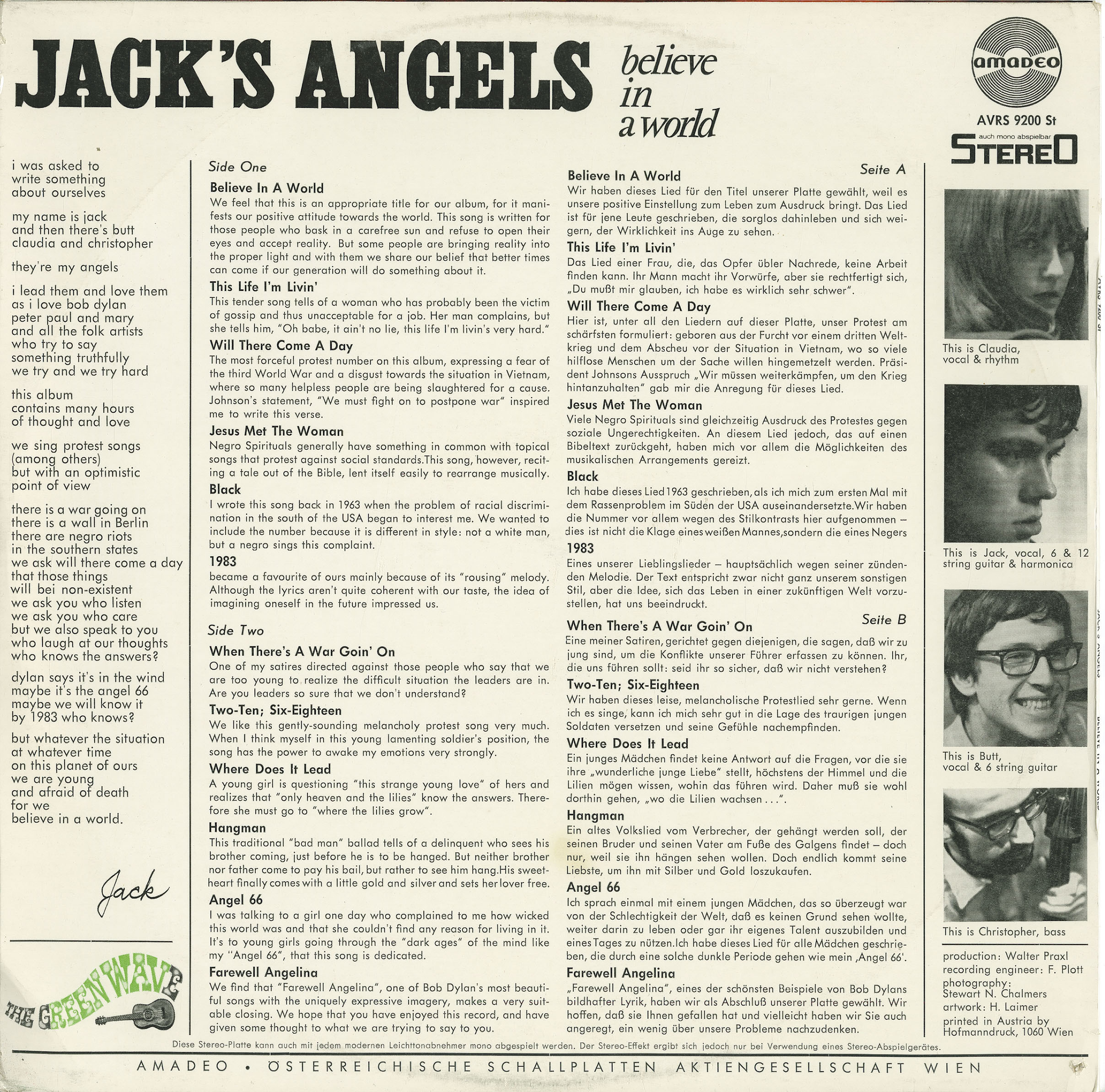 After high school, Jack returned to Austria and attended the Academy of Arts in Vienna. It was during his art school years that his music career began to flourish. In 1966, he formed Jack’s Angels, a folk group that recorded four successful albums with Amadeo Records in Vienna. After the group disbanded, Jack continued as a solo artist, releasing three albums: The Way I Want To Live, My Ship, and Toronto (produced by Alexis Korner and featuring Mick Taylor of the Rolling Stones).