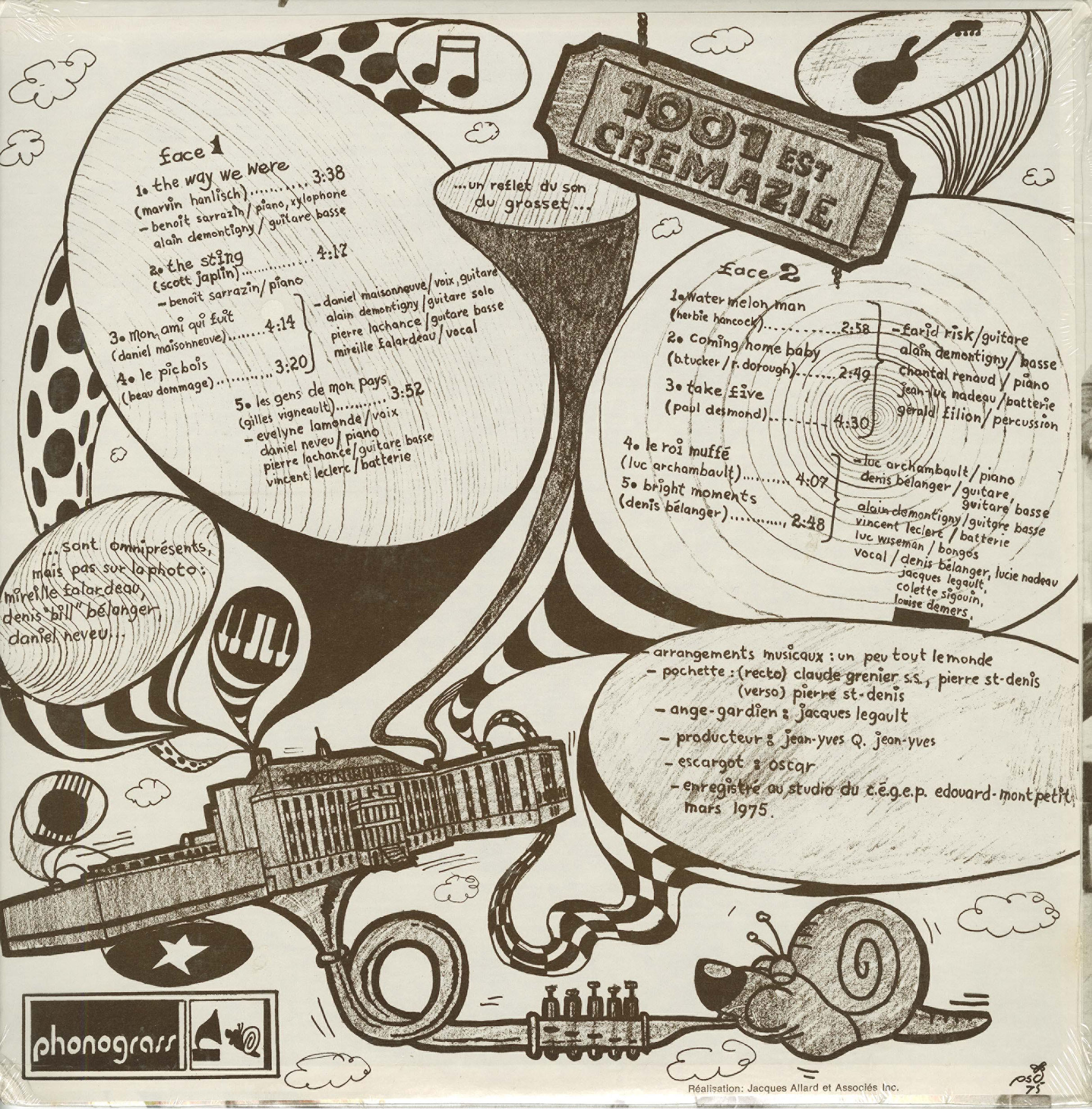 Recorded in 1975 by the Rocking Grass Band — a lively collective of students and teachers at Montreal’s Collège André-Grasset — the album grew out of the excitement generated by a series of sold-out performances at the school. With support from the institution, and encouragement from socio-cultural animator Jean-Yves Quesnel, the group partnered with colleagues from Cégep Édouard-Montpetit to record the sessions at the college’s modest studio facilities. Pressed privately in a run of just 500 copies, 1001 est Crémazie was initially distributed within a small community of friends, students, and supporters.