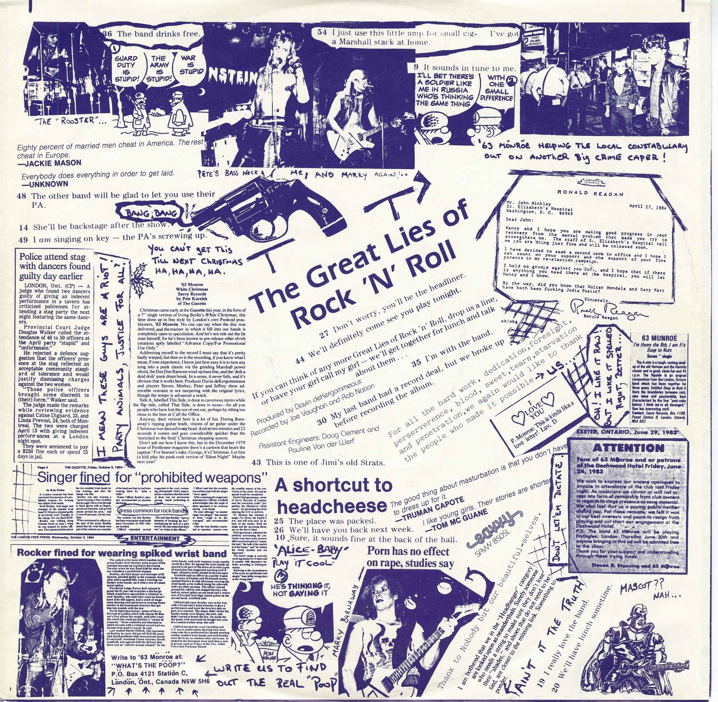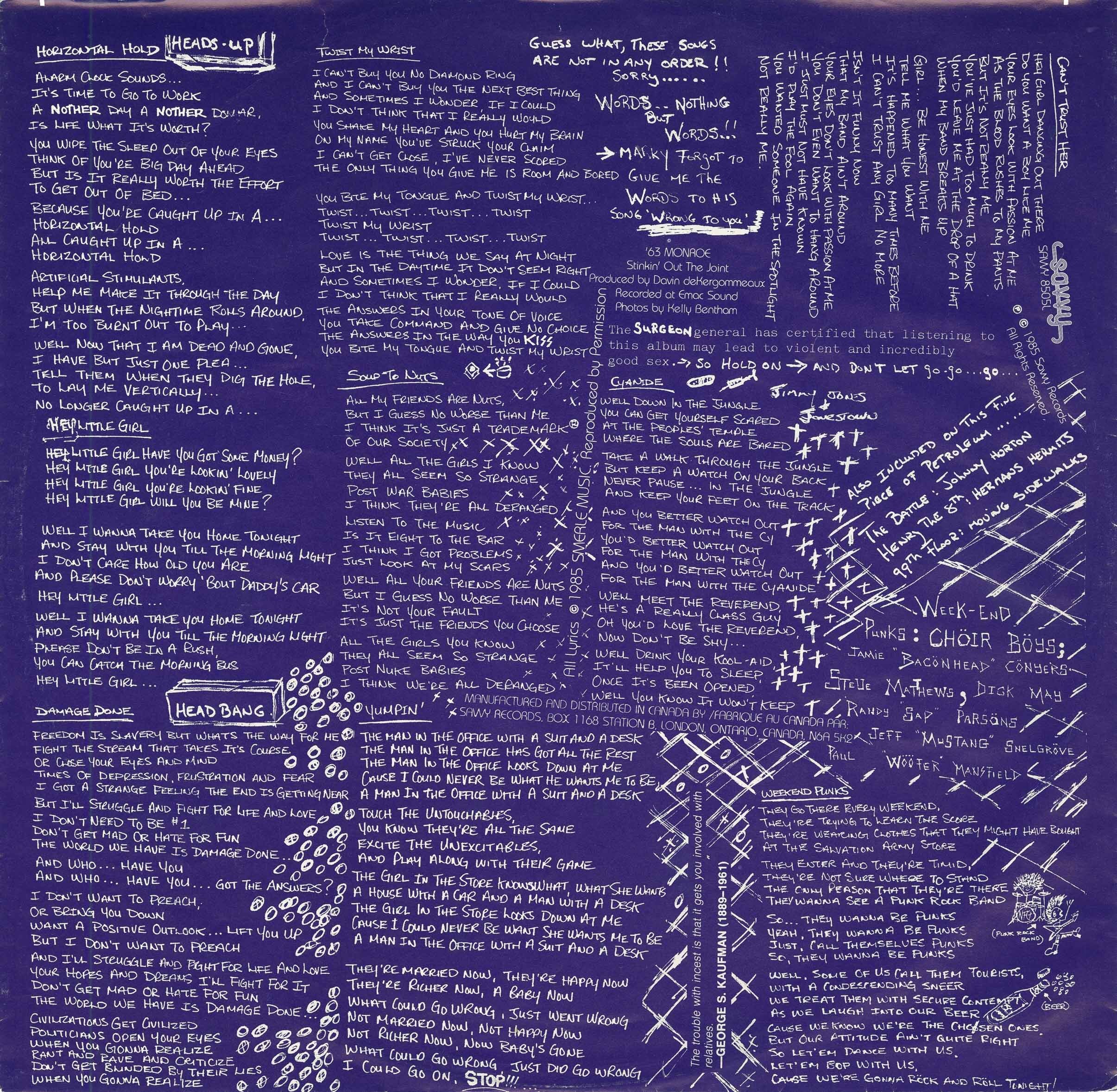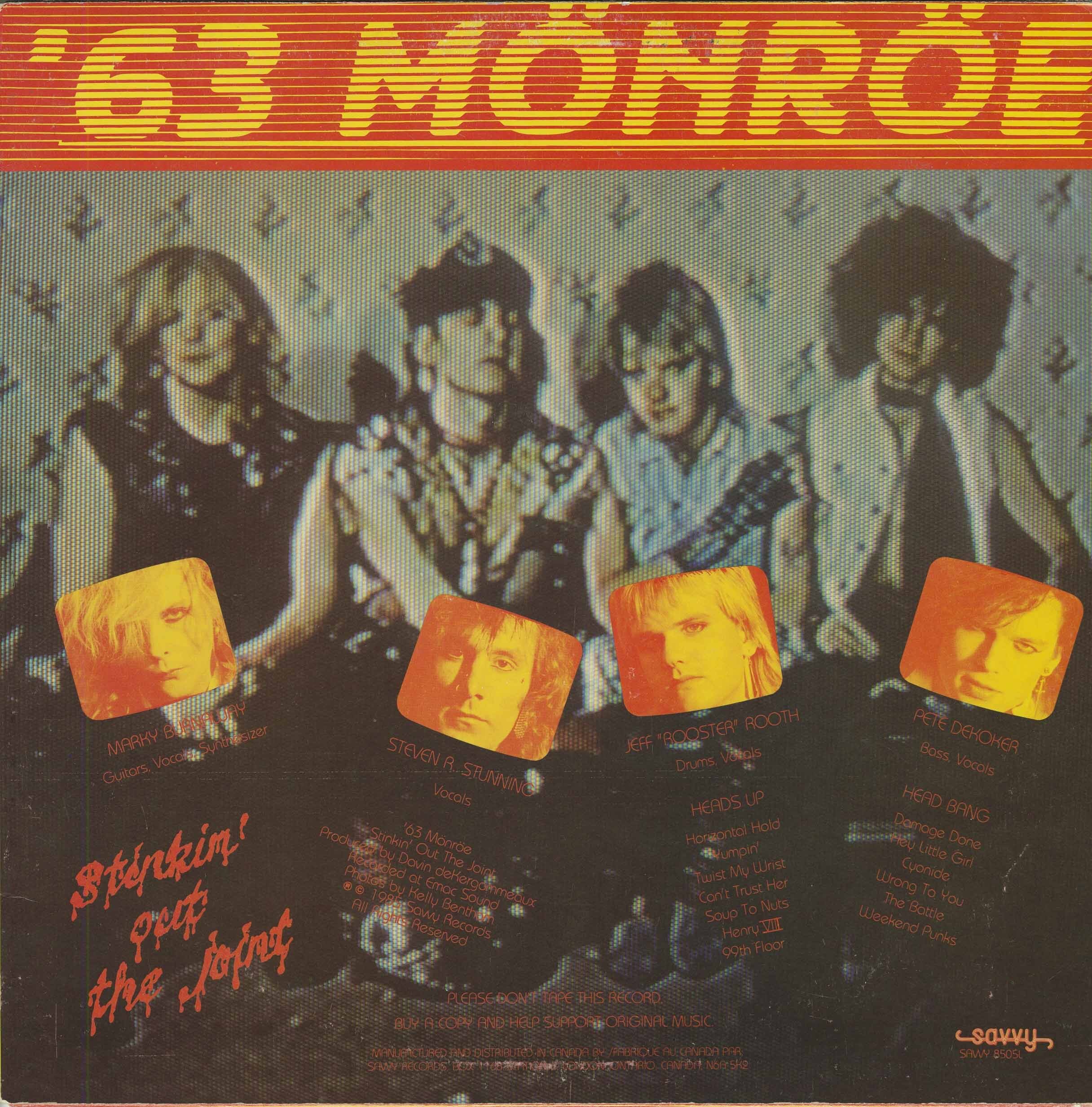In 1985, the band released their second album, the highly praised Stinkin’ Out the Joint. SOTJ is a back alley blast of rattling cans and fists on flesh – a steady and raw groove of chunky metal and slumbering punk. Stunning’s voice on SOTJ is particularly interesting, like a psychedelic Wolfman with a new wave echo and inaudible lower east side tongue. The whole thing lacks severely in production value, giving you a sense of what it would have been like to be front row at The Cedar Lounge for a rock show. The success of SOTJ took ’63 Monroe beyond London’s borders, including a show at CBGB’s in NYC with Johnny Blitz’s band...