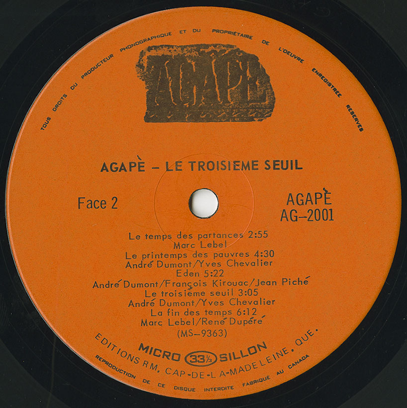 Agapè released Le Troisième Seuil, considered "The Holy Trinity of Quebecois Folk", a Christian underground record in 1972 pressed privately on Agape AG-2001.