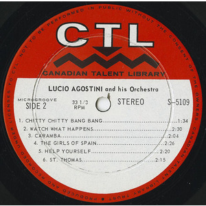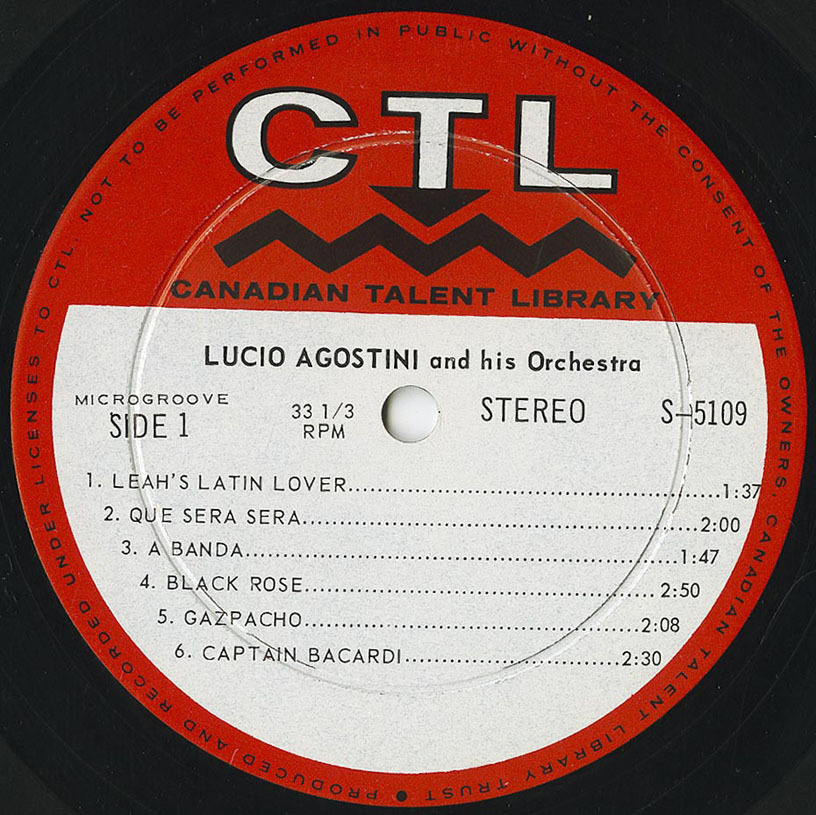 Latin American music has long been a specialty of Lucio Agostini, and The Canadian Talent Library is pleased to present this new album which has not only been especially arranged and conducted by Mr. Agostini, but features three of his own compositions, recorded for the first time — “Leah’s Latin Lover”, “Caramba” and “Black Rose”.
