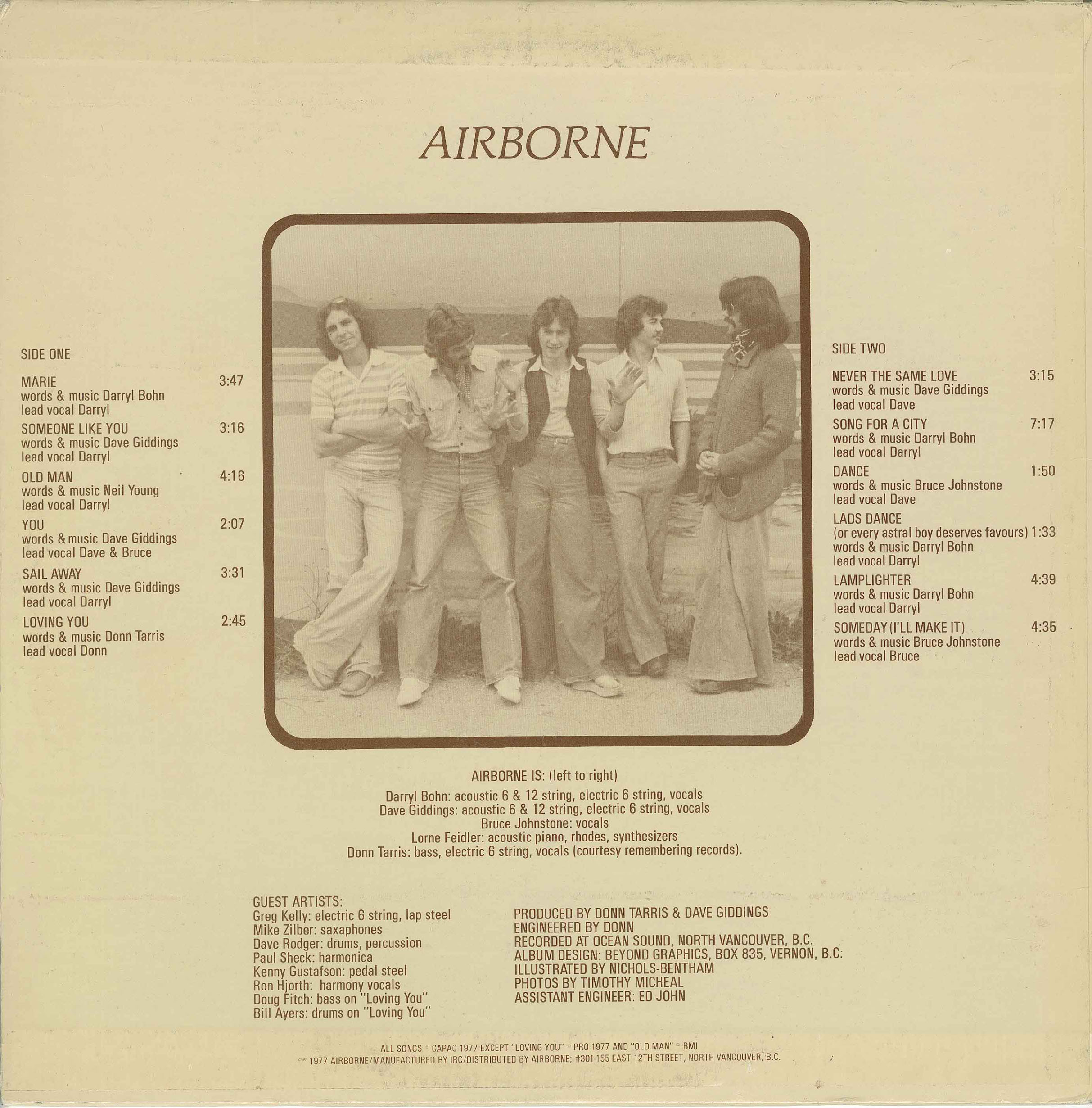 Airborne began as a trio in 1974—Darryl Bohn, David Giddings, and Ron Hjorth—trading songs and harmonies in coffeehouses around the city. Their acoustic guitars were the foundation, but it was the shared voices that carried the songs, especially once Bruce Johnstone joined and the group began to explore the possibilities of layered vocals. The addition of keyboardist Lorne Fiedler and bassist/vocalist Donn Tarris expanded the palette further, allowing the group to move beyond folk into something more fluid and ensemble-driven.