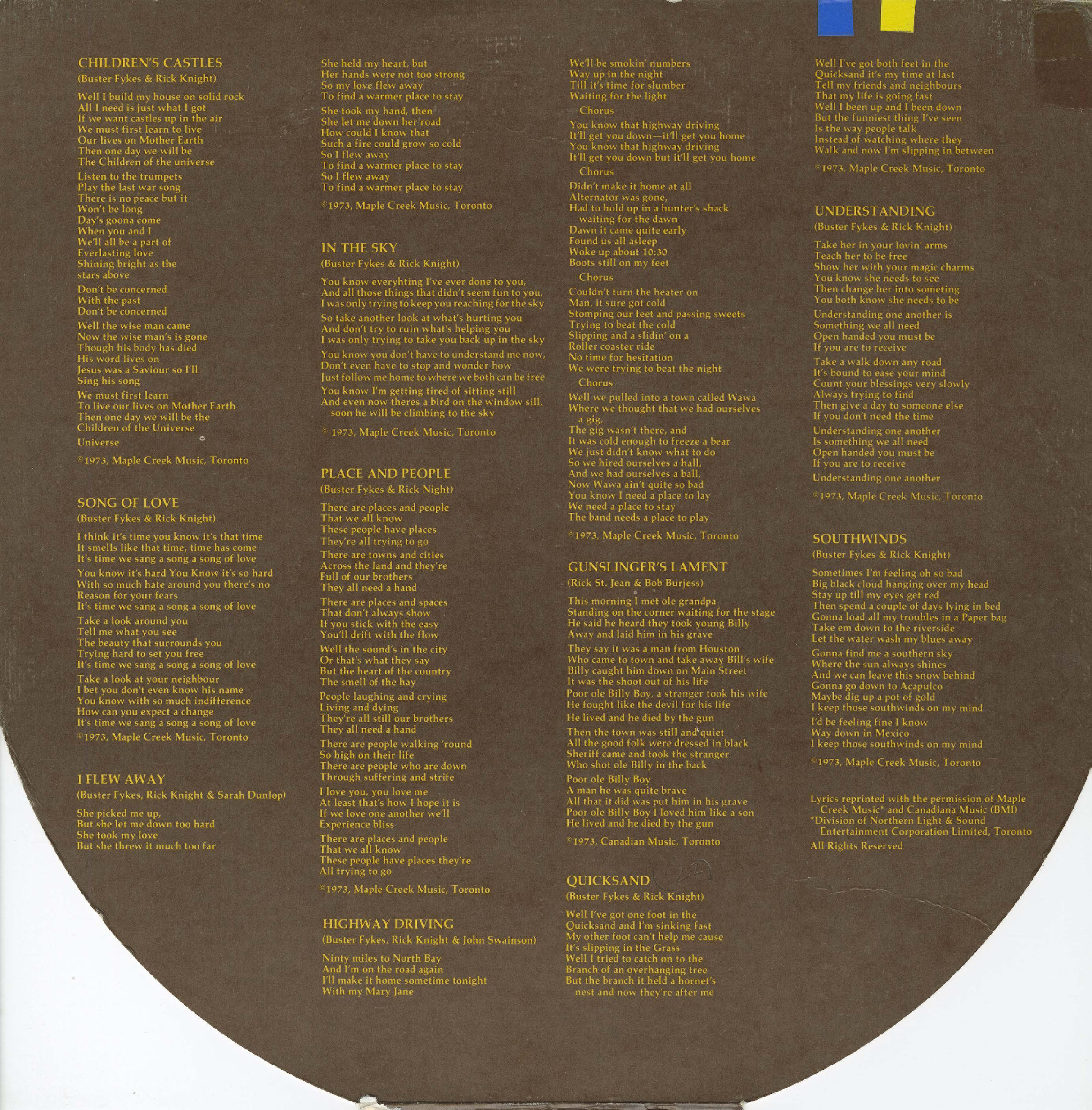 The group’s songwriting partnership of Fykes and Knight yielded eight originals, and their first single, “Song of Love,” reached the Canadian RPM Top 100, peaking at No. 26 in June 1973. Its follow-up, “Highway Driving,” climbed to No. 42 two months later and became the band’s signature piece—a free-wheeling ode to the Trans-Canada Highway that captured the essence of restless touring life. Its lyrics, opening with the immortal line “Ninety miles to North Bay, and I’m on the road again”, turned the song into an unofficial anthem for long-haul musicians and weekend travellers alike. Both singles were issued on Toronto’s Smile Records imprint, distributed nationally through London Records.
