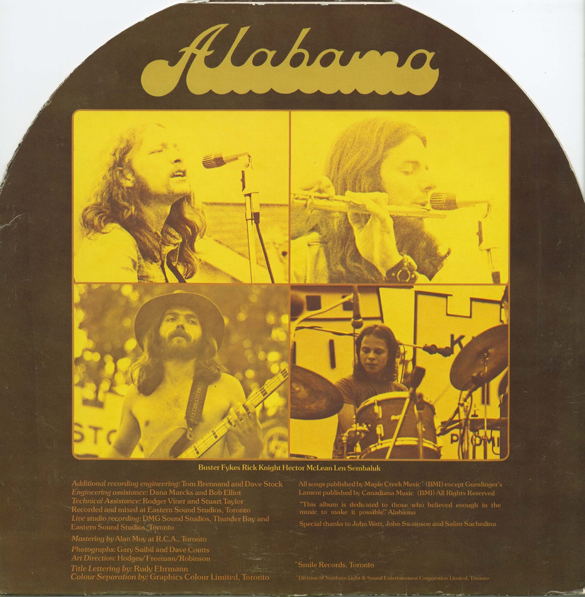 Alabama was a Toronto-based band formed around 1972 by James “Buster” Fykes, Hector McLean, Rick Knight, and Len Sembaluk—four musicians who together forged a distinctive blend of progressive rock, Cajun rhythm, country warmth, and blue-eyed soul. Fykes and Knight, both originally from Alabama, brought their southern influences north to Ontario, where they settled and began shaping a sound that merged roots sensibility with the open-minded experimentation of the early seventies. Their approach stood apart from the polished Nashville mainstream, favouring instead a looser, road-worn spirit reflective of Canada’s own cross-country bar-band tradition.