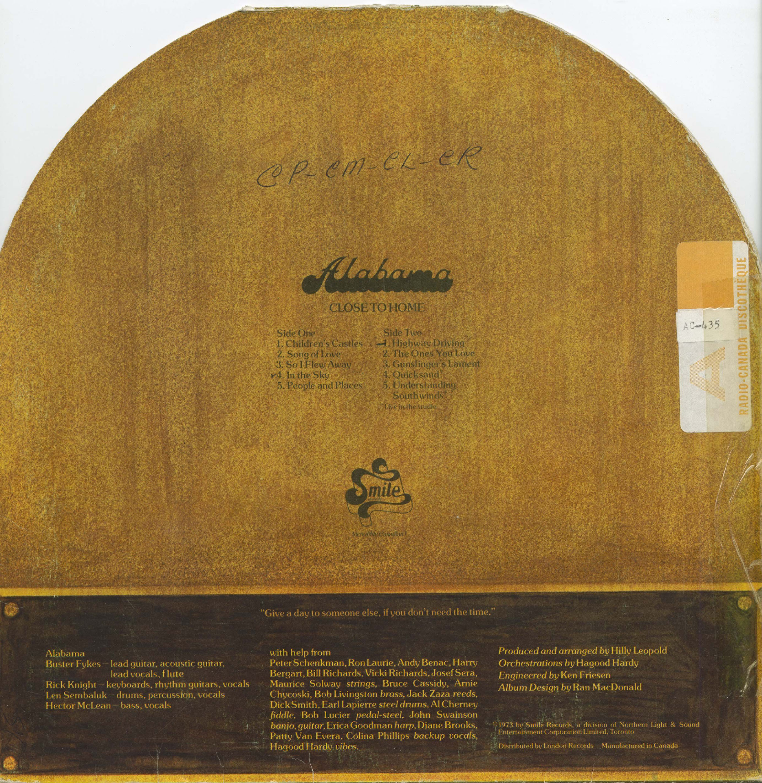 That same year the band released their lone LP Close to Home, recorded at Eastern Sound Studios with producer Hilly Leopold and engineer Ken Friesen. It showcased a richly layered studio production unusual for a regional country-rock act, featuring contributions from many of Toronto’s leading session players: Al Cherny on fiddle, Bob Lucier on pedal steel, Hagood Hardy handling orchestrations and vibraphone, and an ensemble of string, brass, and vocal collaborators including Colina Phillips, Diane Brooks, and Patty Van Evera. The material ranged from the dreamy introspection of “Children’s Castles” and “People and Places” to the cinematic sweep of “Gunslinger’s Lament” and the bittersweet reflections of “The Ones You Love.” For a brief moment, Alabama seemed poised to bridge Canada’s growing fascination with roots music and the broader progressive scene.