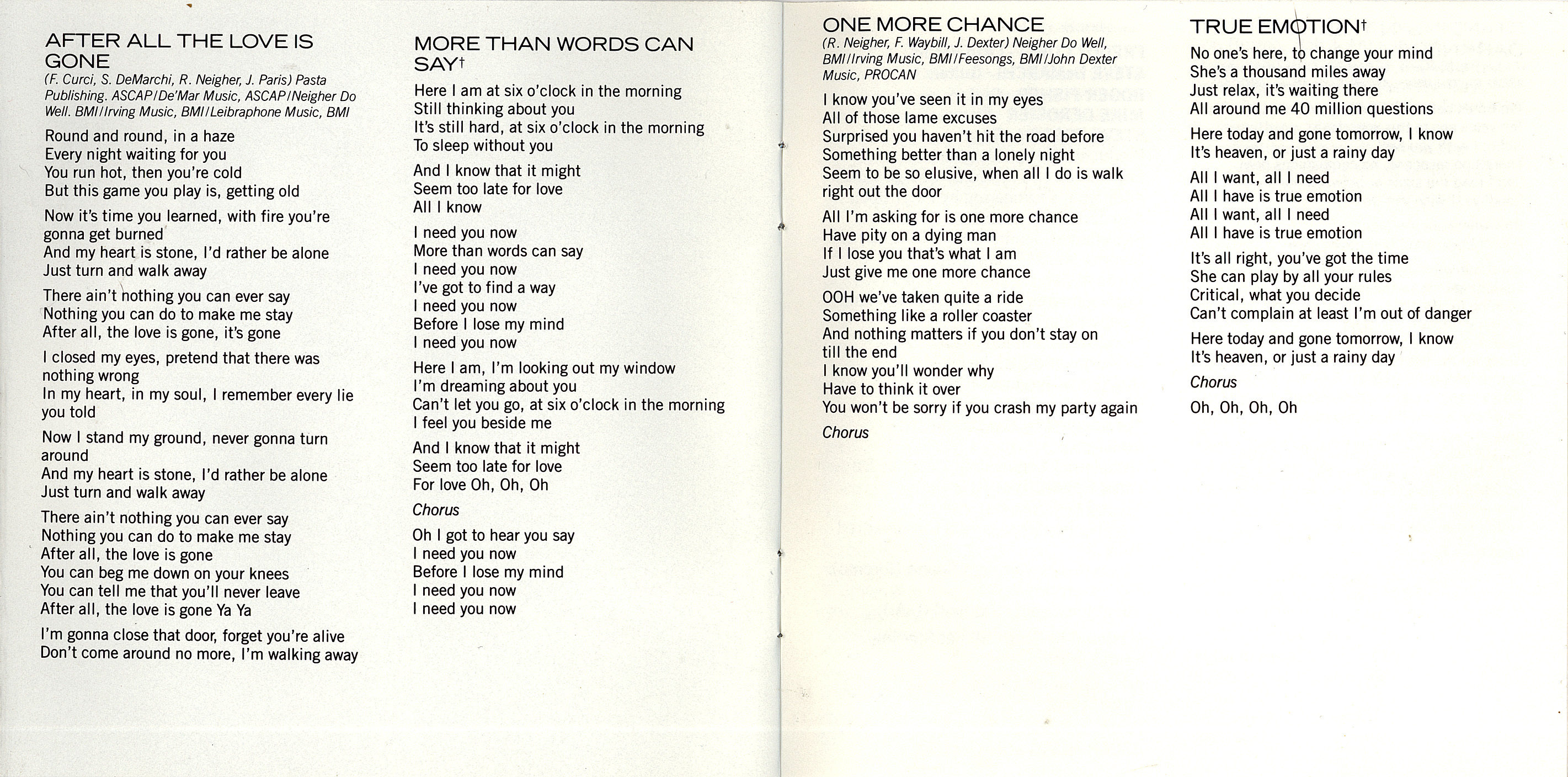 The single "More Than Words Can Say" reached No. 1 in Canada and No. 2 in the United States. A third single, "Waiting for Love", was released in early 1991 and peaked at No. 13 on the U.S. Billboard Hot 100.
