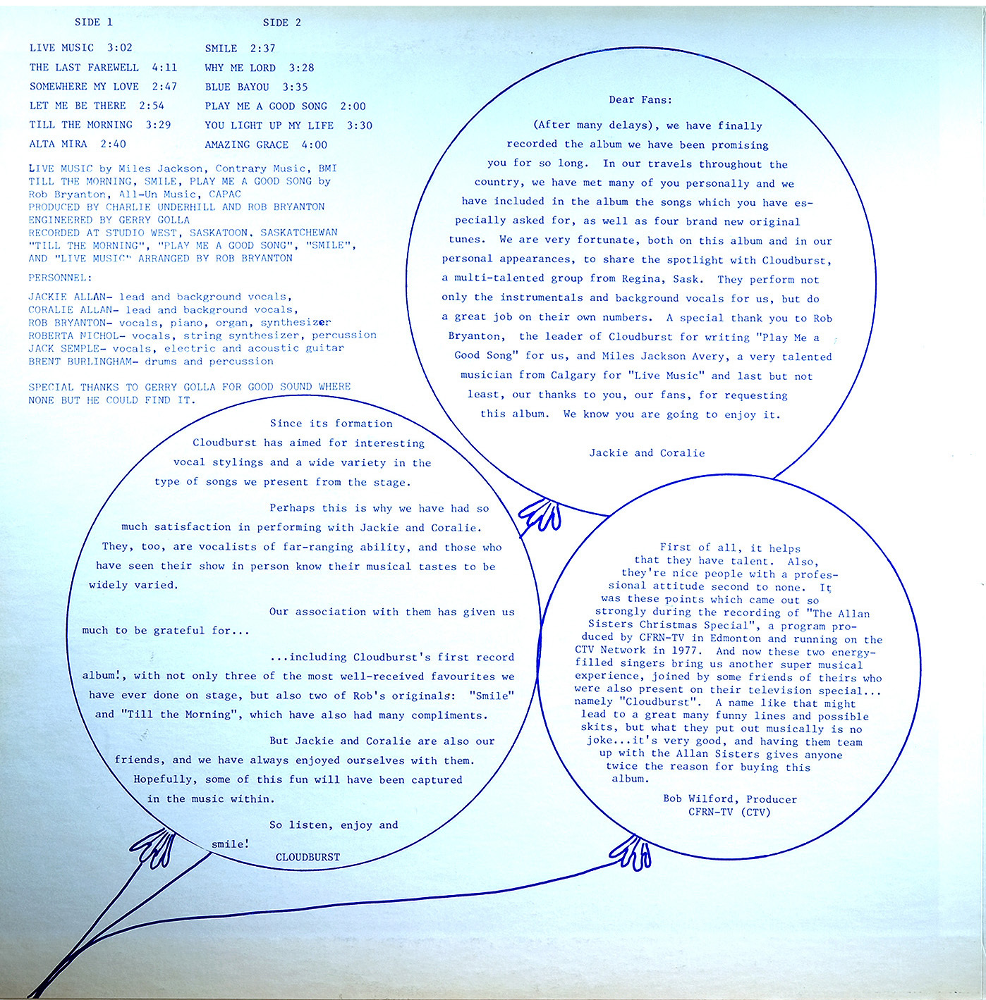 In the late 1970s they began working with the Edmonton pop ensemble Cloudburst (future Juno winner Jack Semple was among its members), who became their touring and recording band. Together they released two independent albums: the pop-leaning Smile (1978) and the gospel-infused double album Precious Moments (1980). Both records reflected the sisters’ versatility and willingness to explore new territory. They toured with Cloudburst until 1983, when they chose to go their separate ways.