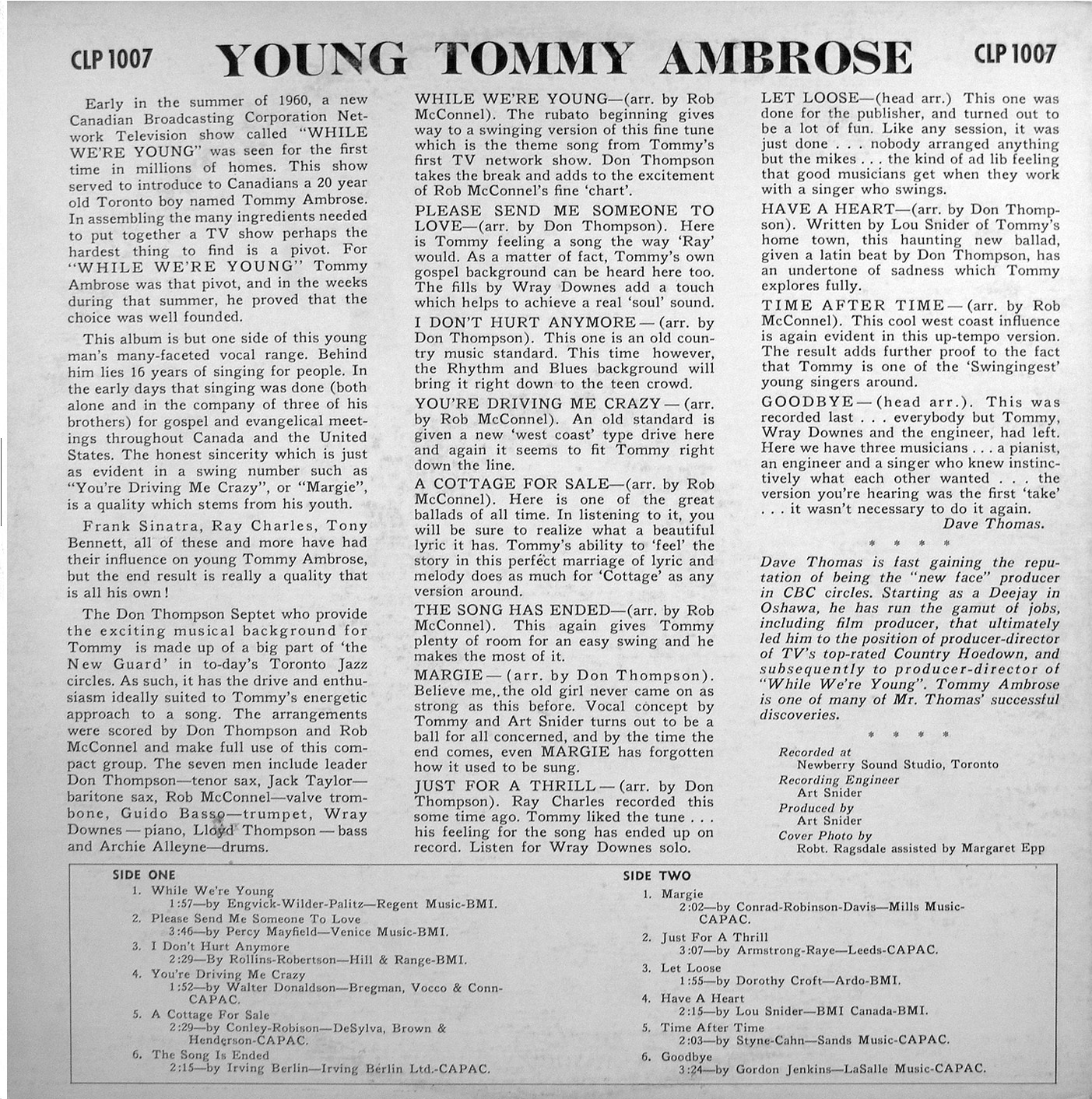 Soon after, Ambrose recorded his debut album, Young Tommy Ambrose, with producer Art Snider for the Chateau label. Backed by a stellar jazz ensemble led by Don Thompson and featuring Rob McConnell, Wray Downes, and Archie Alleyne, the record revealed a singer of uncommon poise and soul. Though trained in gospel, Ambrose’s phrasing drew comparisons to Tony Bennett and Ray Charles—yet his sound was always his own: clean, emotive, and naturally tuned to melody. His early singles for Sparton and Chateau, including “The Magic of You” and “I Need Your Love,” earned national airplay and showcased his command of both jazz ballads and swinging pop.