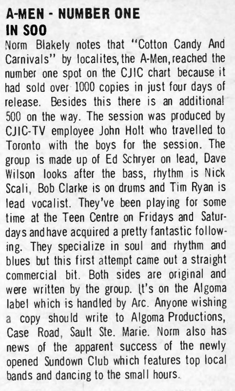 Known locally for their original songs and Clarke’s signature 15-minute drum solos, The Amen quickly became staples of the Sault’s Teen Centre and began touring across northern Ontario, performing in Thunder Bay, Espanola, and Nipigon.