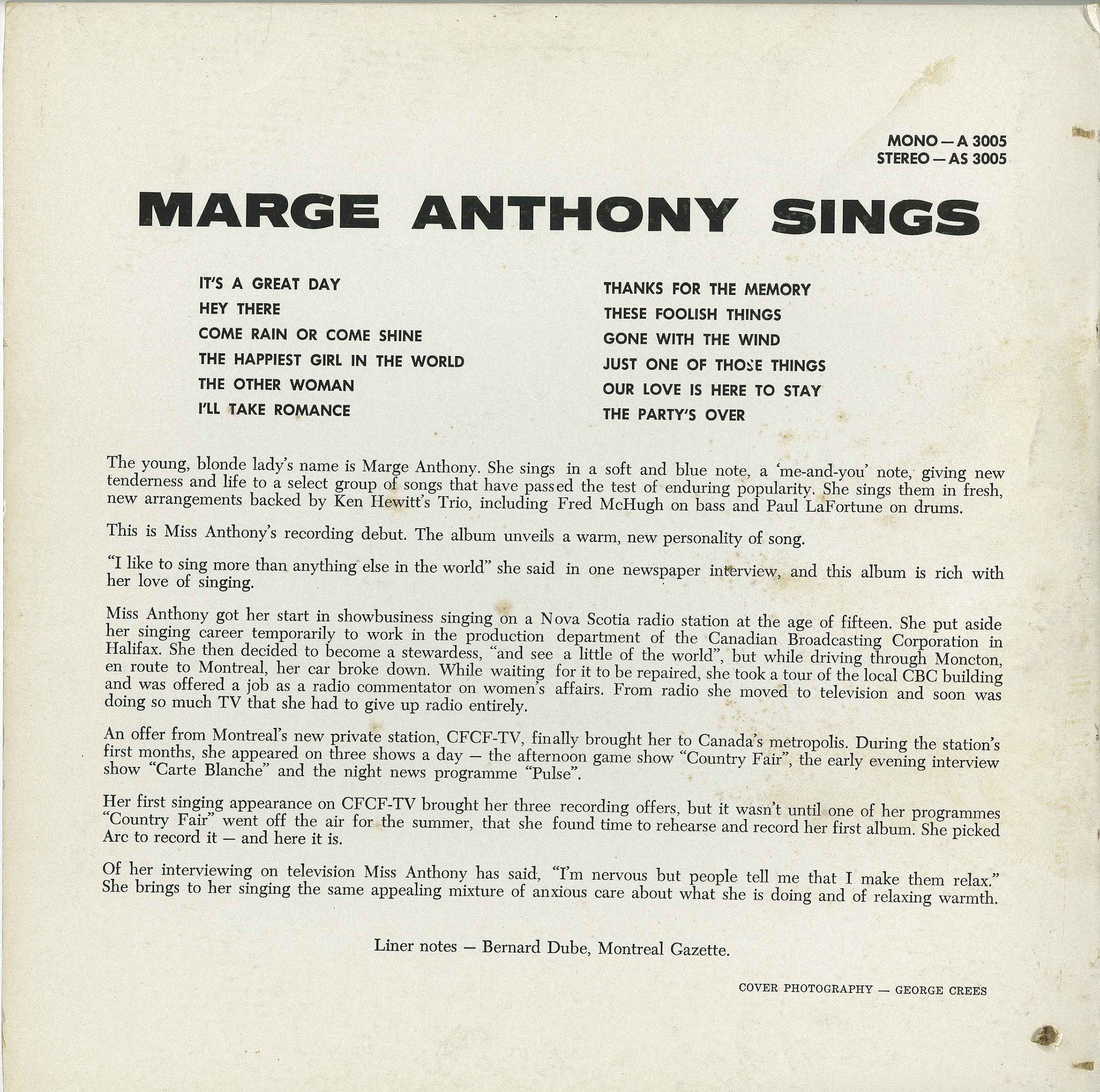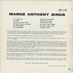 Born in Mill Village, Nova Scotia, on October 10, 1935, Marge Anthony made her entry into broadcasting 13 years later, singing and tap-dancing on radio station CKBW Bridgewater, on a program that also included a very young Donald Sutherland.