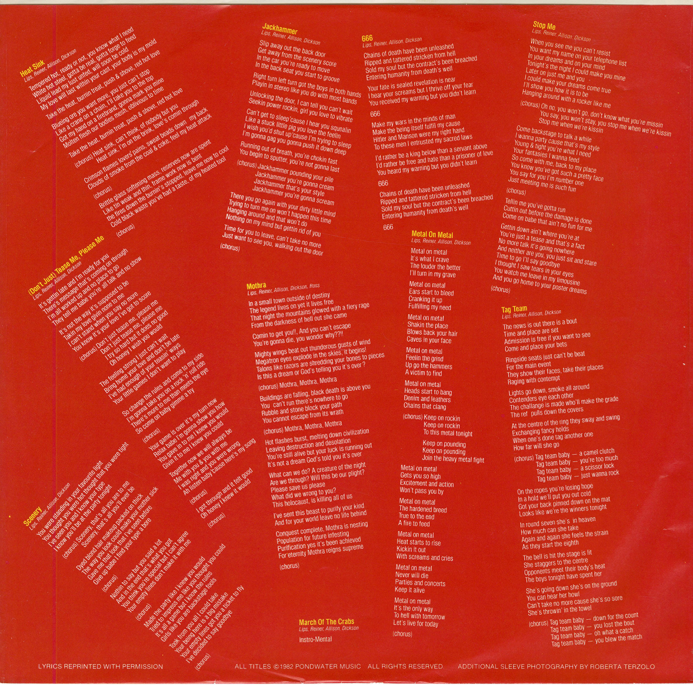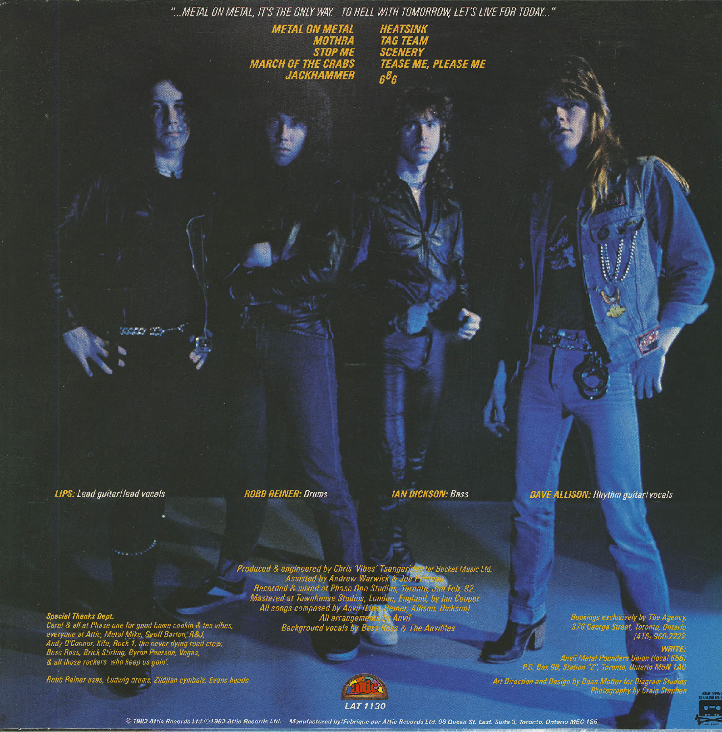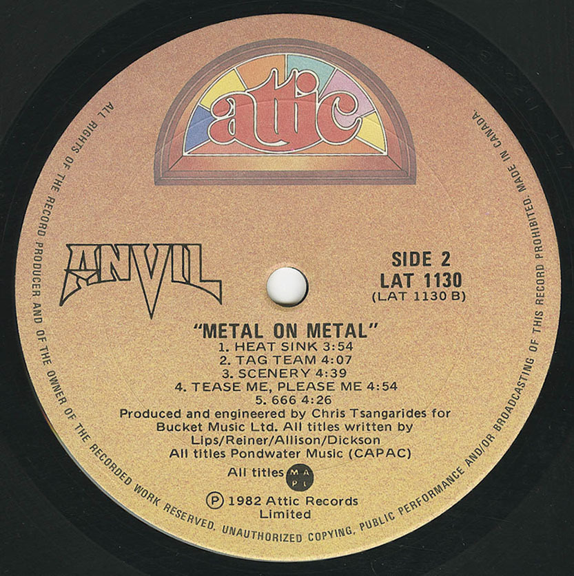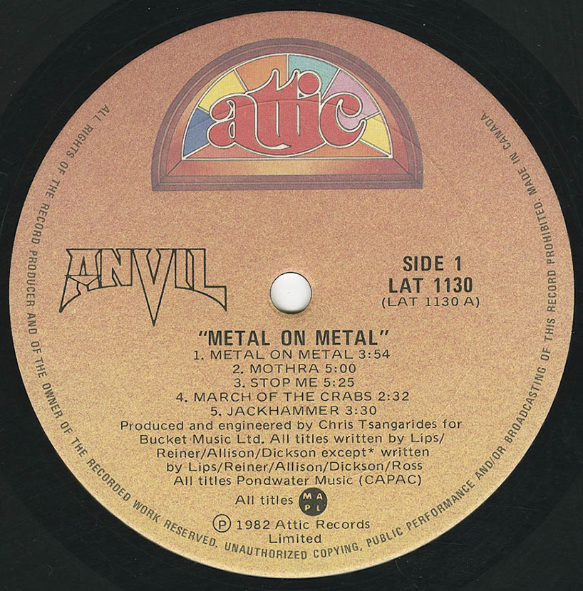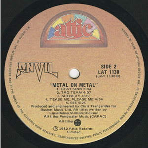 Metal On Metal is the second studio album by Canadian heavy metal band Anvil, released on April 15 1982. The album was produced by Grammy-nominated producer Chris Tsangarides (Judas Priest, Black Sabbath, Thin Lizzy). The band's influence on notable heavy metal groups Megadeth, Slayer, Anthrax, and Metallica is evident in the growl and howl of Steve "Lips" Kudlow's vocals on the title track and the chugging guitars and blistering blast beats of "March Of The Crabs." Anvil! The Story of Anvil (2008), an Emmy-winning documentary about the band by director and former Anvil roadie Sacha Gervasi, has been lauded as one of the greatest "rockumentaries" ever made.