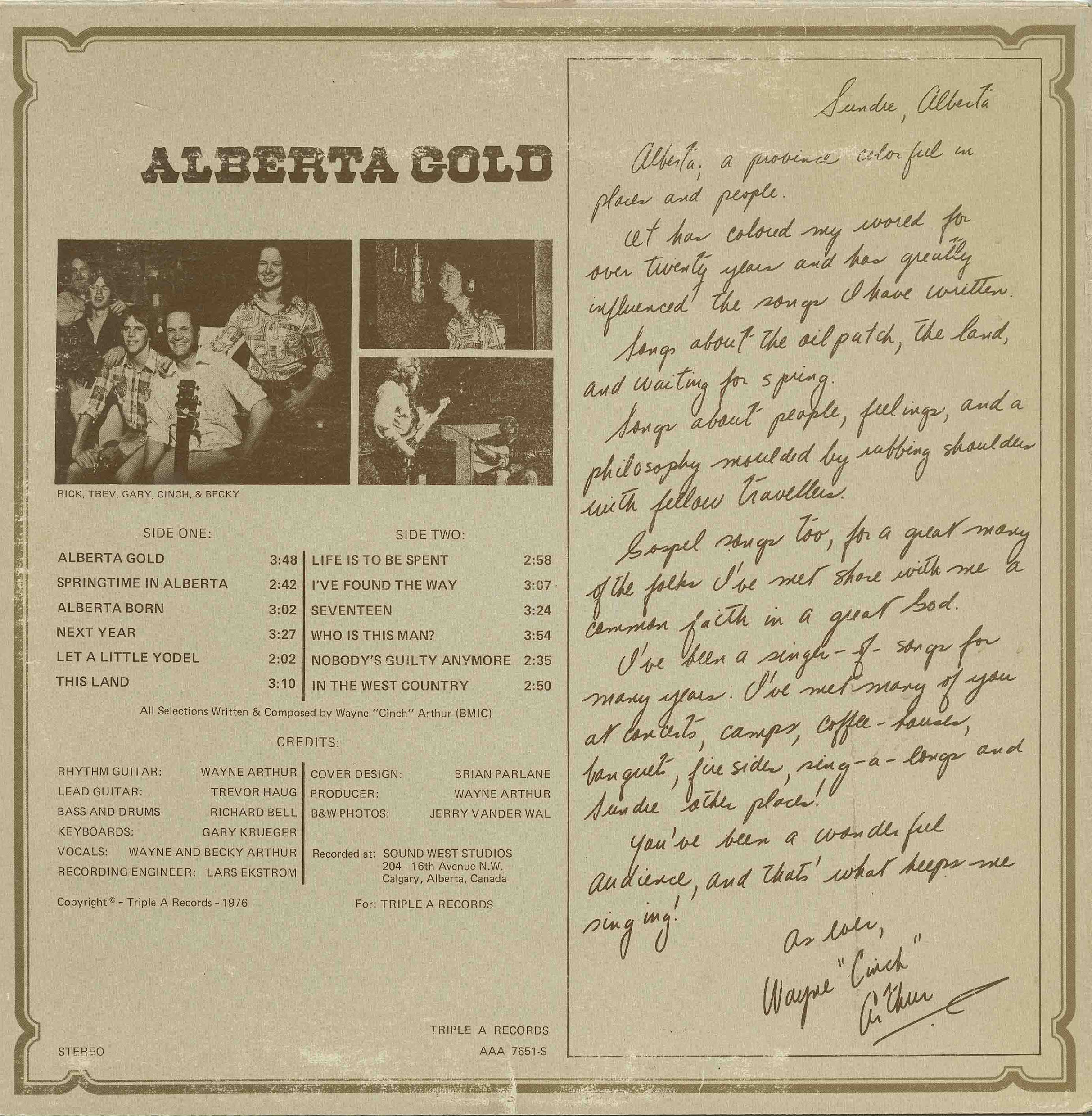 Music was one of the earliest threads running through his life. In 1976 he recorded his first LP, “Cinch” Sings, at Ernest Klumpp’s E.K. Recording Studios in Calgary. The album mixed traditional material with originals and showcased Arthur’s distinct yodeling style, intimate vocals, and easy, unforced delivery. That same year he followed it with Alberta Gold, recorded at Sound West Studios, which leaned more heavily on original compositions celebrating the province’s landscapes, ranching culture, and family roots. These two independently released albums remain valued snapshots of prairie folk and cowboy music from the mid-1970s.