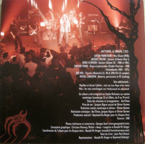 Aut'Chose remercie du fond de son franc coeur, les personnes suivantes qui l'ont supporté tout au long de ce merveilleux projet de poésie rock : Claudine Bertrand, Virginie Francoeur, Donald Francoeur, Urbano Diaz, René Binet, Bernard Pozier et Louise Blouin, Yvon Delisle, Hugo Veilleux, Linda Laporte, Benoit Dostaler, Martine Leduc, Josée Séguin, Paul Beauregard, Nicolas Deslauriers, Michel Barette, Denis Rodier et Claudine Millaire, Solange et Manuel Miljours, Lucette, Allan, Linda, Richard, Évelyne, Percey Harper, Richard et Jonathan Leboeuf-Mc Gregor, Daniel Jérôme, Tom Pilon, Dan Beaulieu, Pierre Beauséjour, Jean Racine, Miriane Bélisle, JF, Katy Gendron...