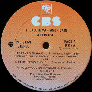 Paroles et musiques de Lucien Francoeur et Jacques Racine excepté Beau bummage et Belle grande blanche par Lucien Francoeur, Jacques Racine et Jean-François St-Georges.